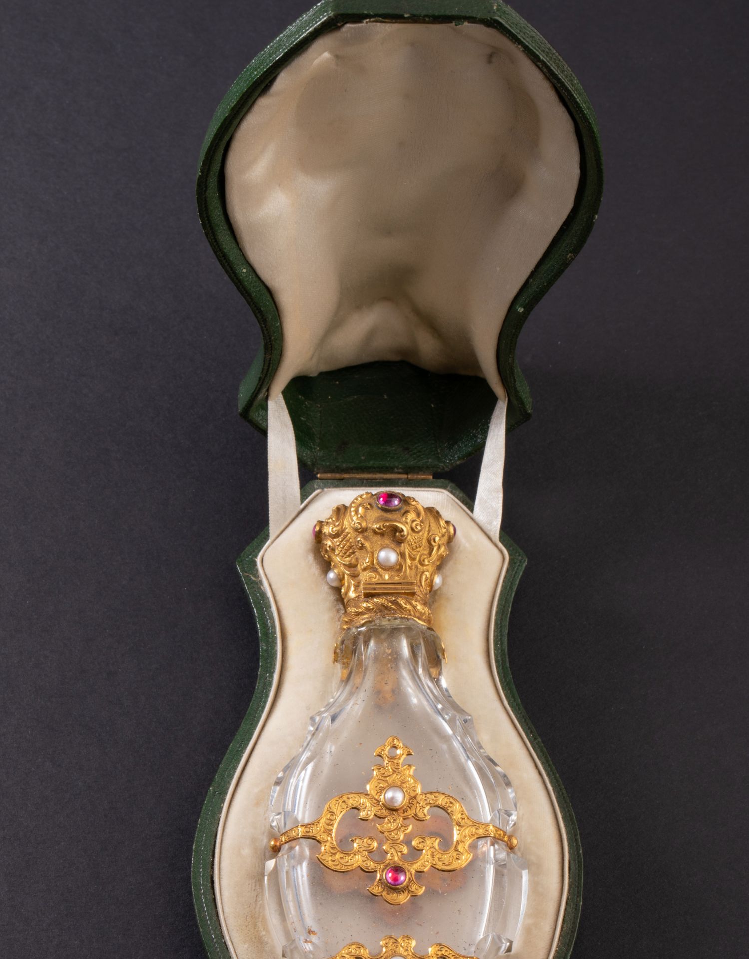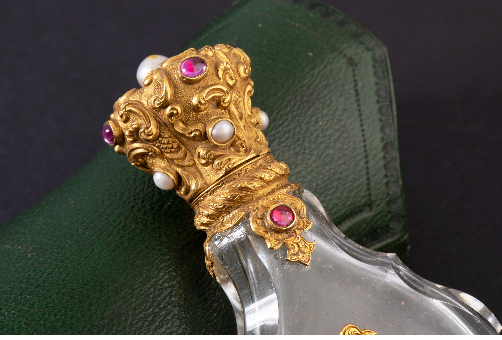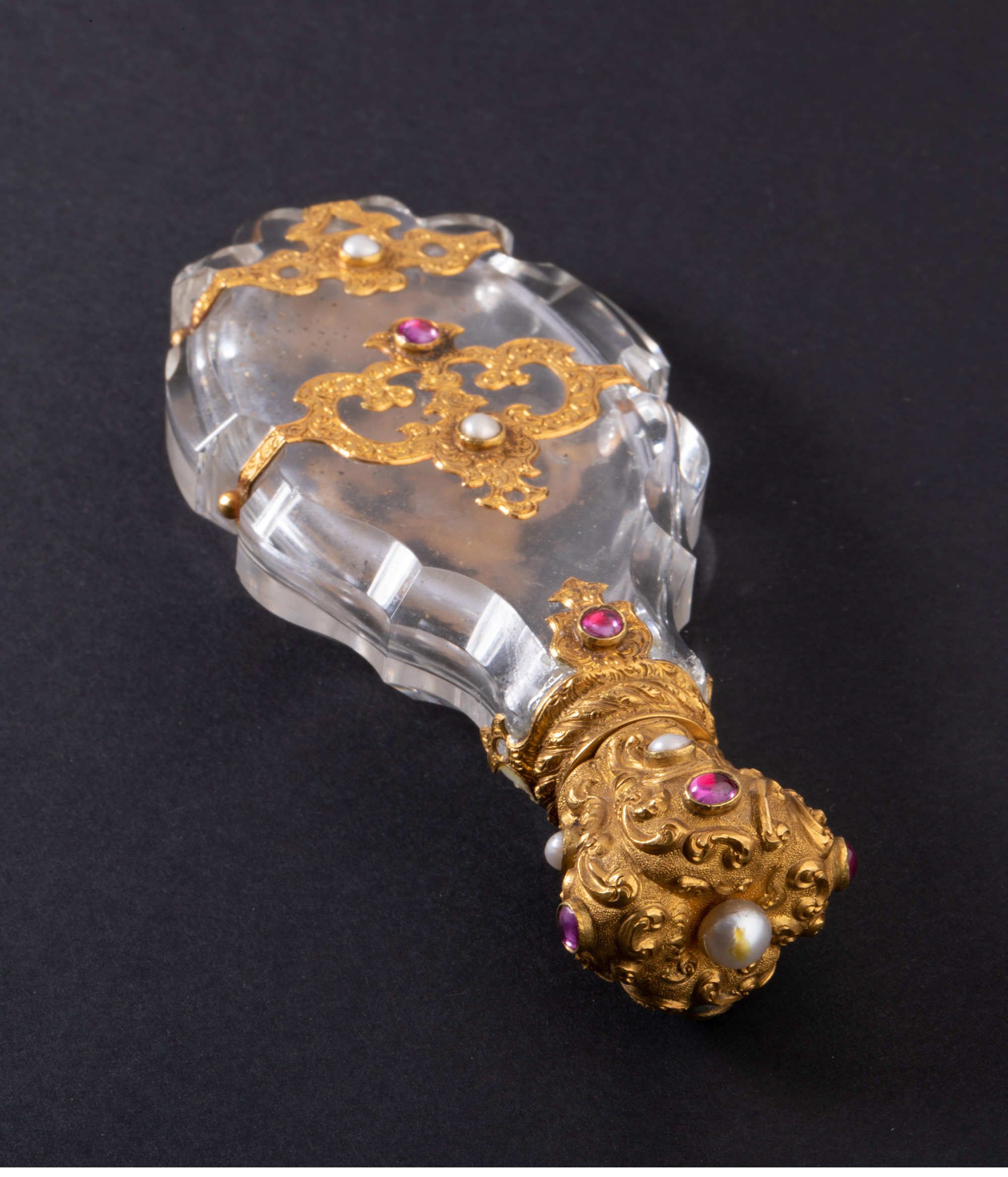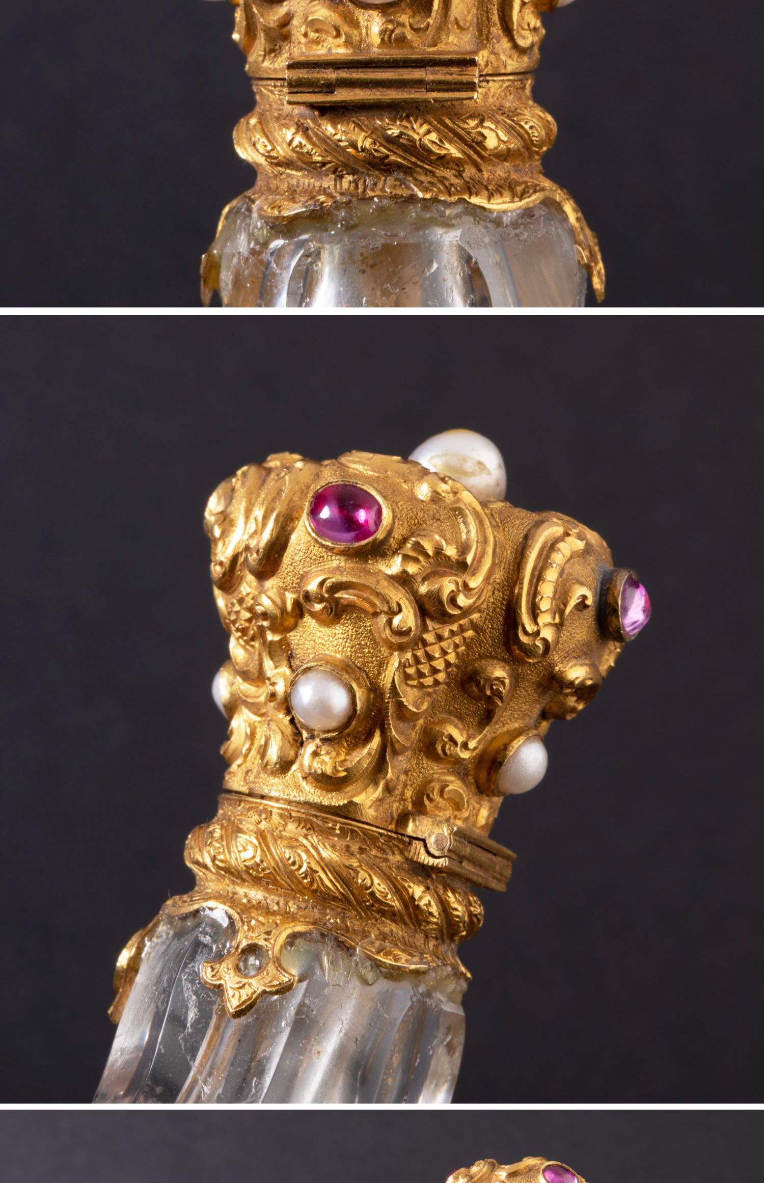 独角鹿西洋古董18K金雕饰镶嵌红宝石珍珠天然水晶香水瓶
