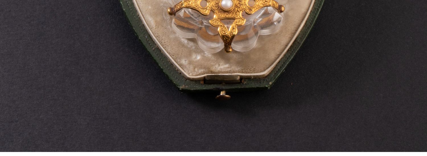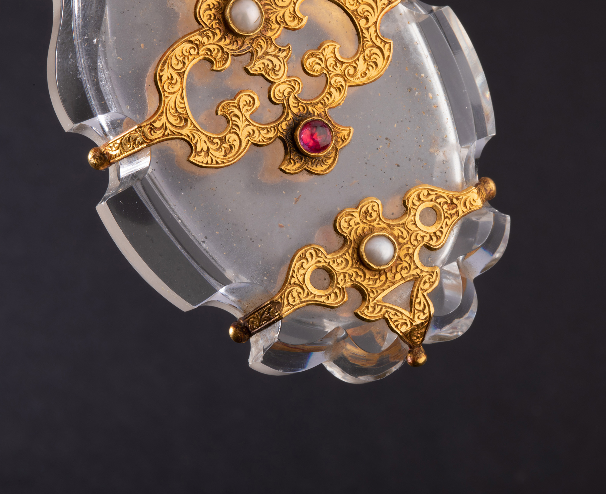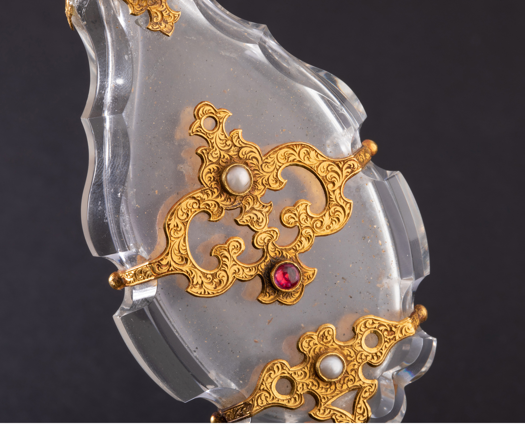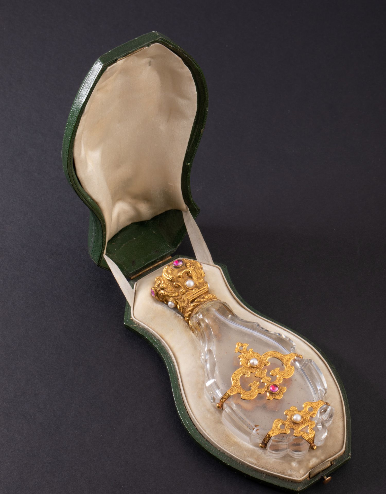 独角鹿西洋古董18K金雕饰镶嵌红宝石珍珠天然水晶香水瓶