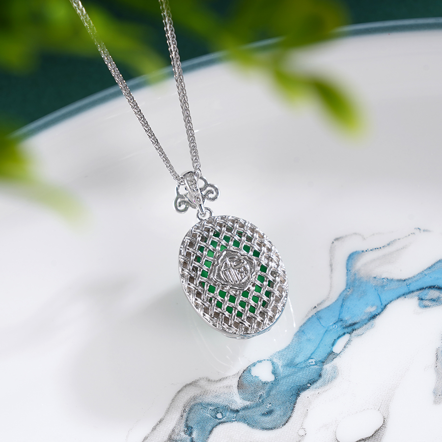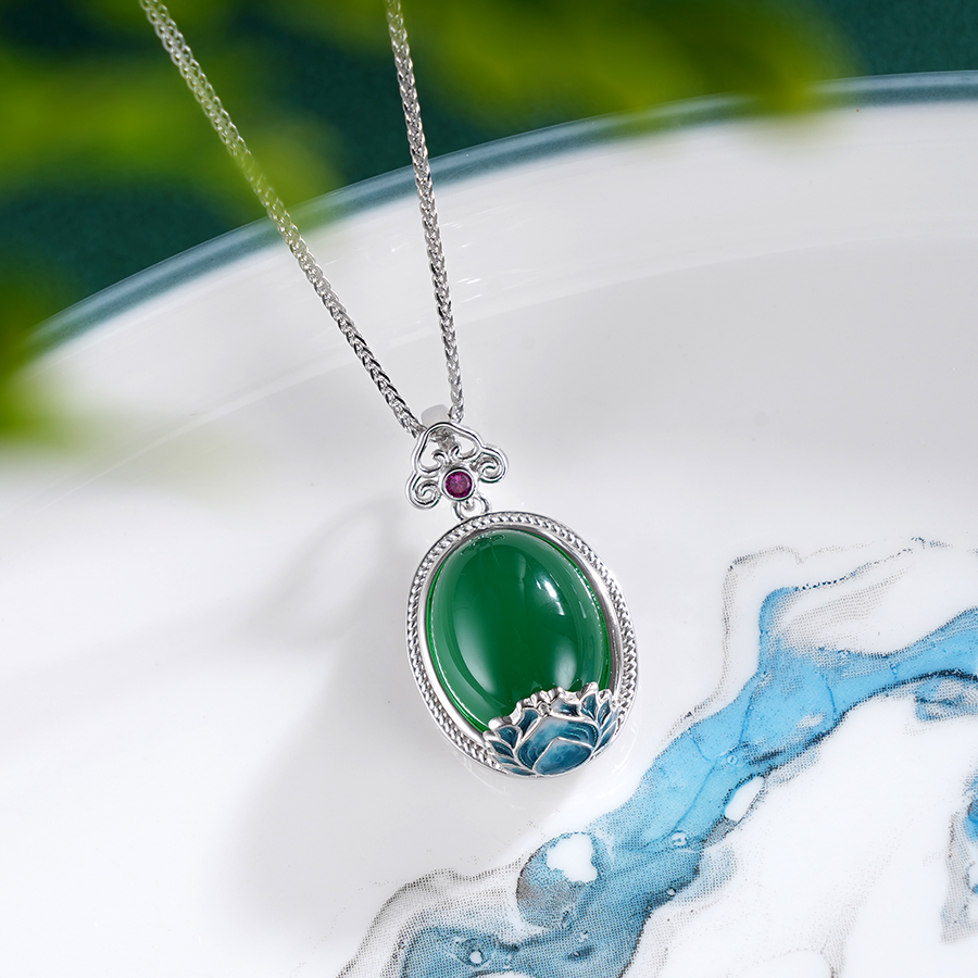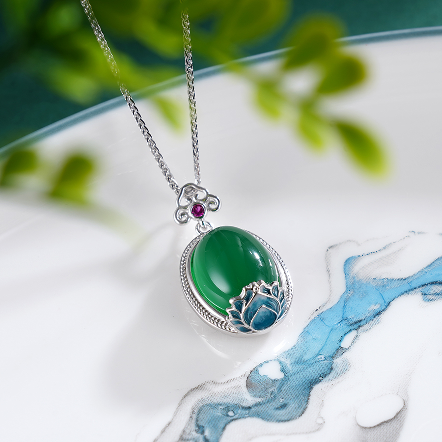 【寓意】:项链以绿玉髓为基,珐琅莲花傍“绿潭”而生。设计师巧施焊接之法,将两者融为一体,尽显清雅宁和之境。寓意好运随水而生,莲香生生不息。
