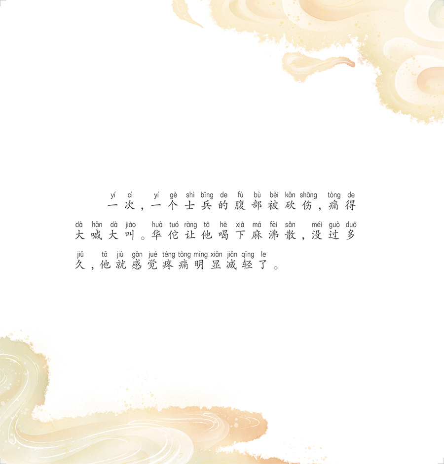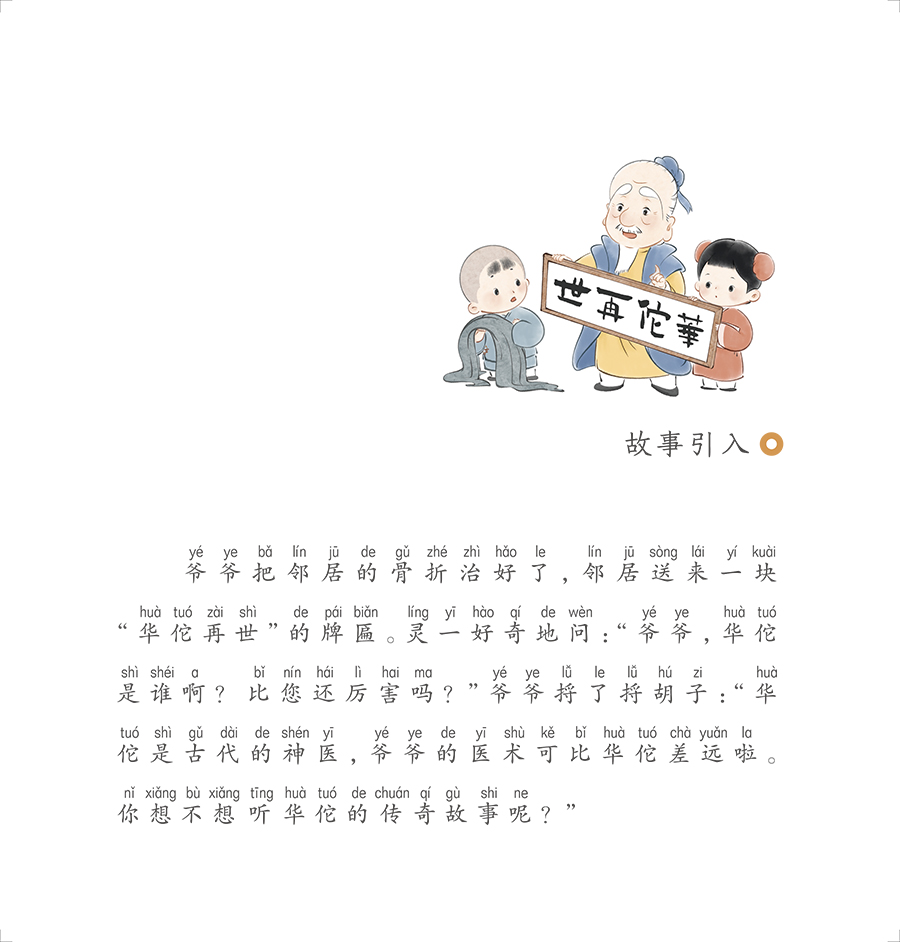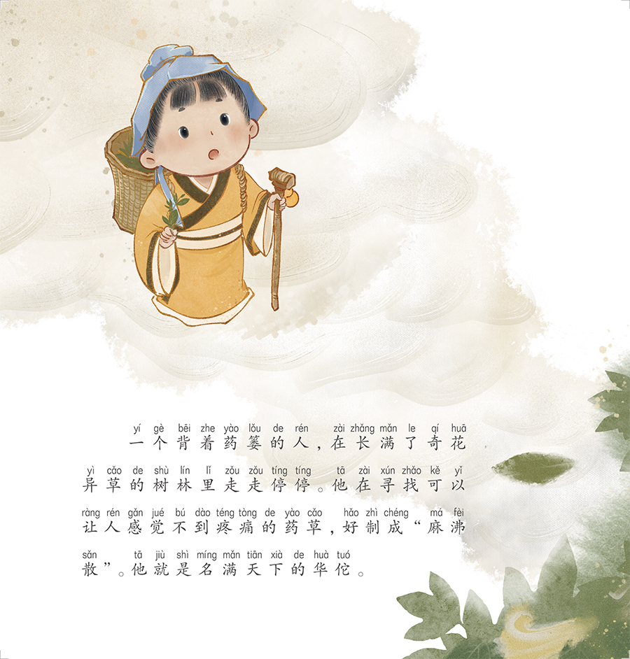 内容提要:“中医启蒙绘本丛书”以《黄帝内经》为创作灵感来源,设计了“岐黄爷爷”“灵一”“素素”“呦呦”四个富有中医特色的卡通角色,采用独具意境的中式美学配色,画风可爱灵动,图书下设角色介绍、故事导入、名医故事、填色互动、故事梗概五大模块。华佗,东汉时期著名医家,中国古代十大名医,精内、妇、儿、针灸各科,外科尤为擅长。他发明并使用了“麻沸散”,是世界医学史上最早的全身麻醉,被称为“外科圣手”,后人亦多以“华佗再世”称誉有杰出医术的医师。此外,他还发明了“五禽戏”。本书讲述了华佗为中毒箭的关羽刮骨疗伤的故事。