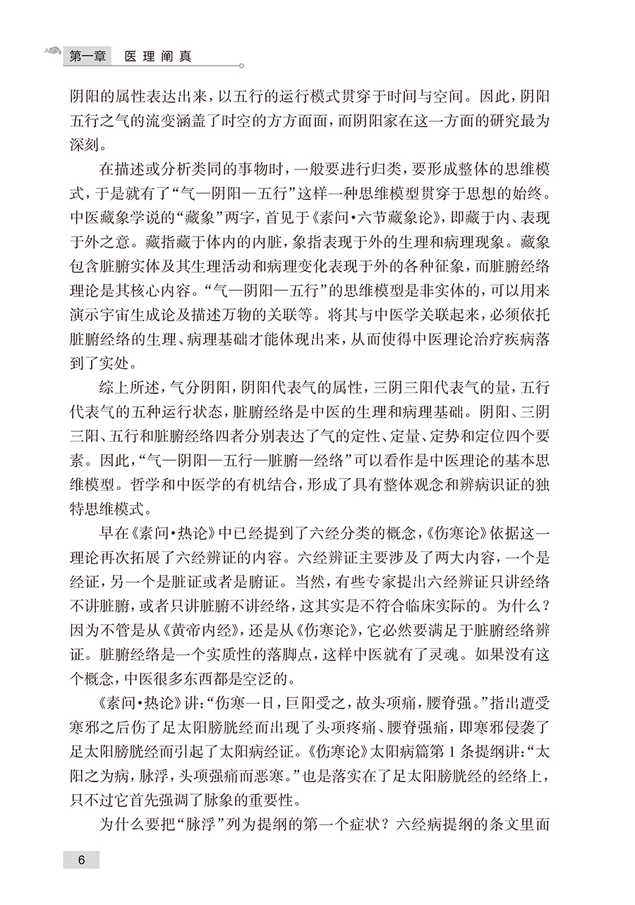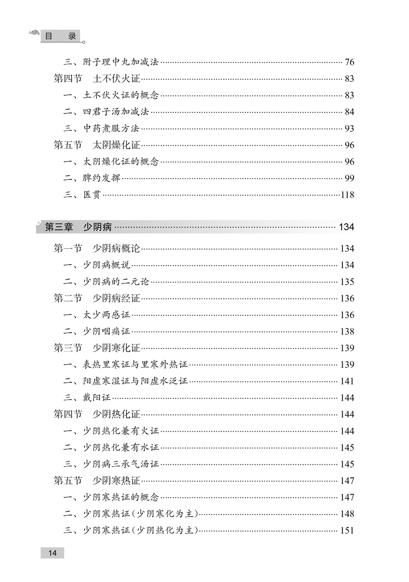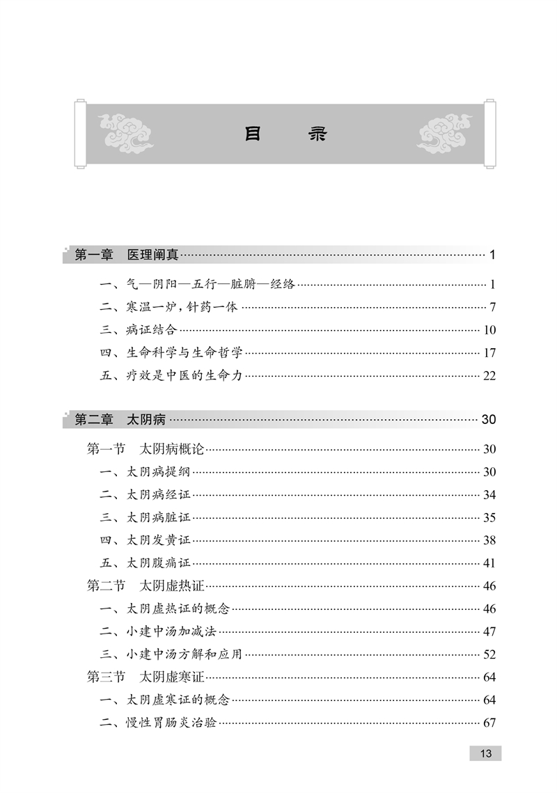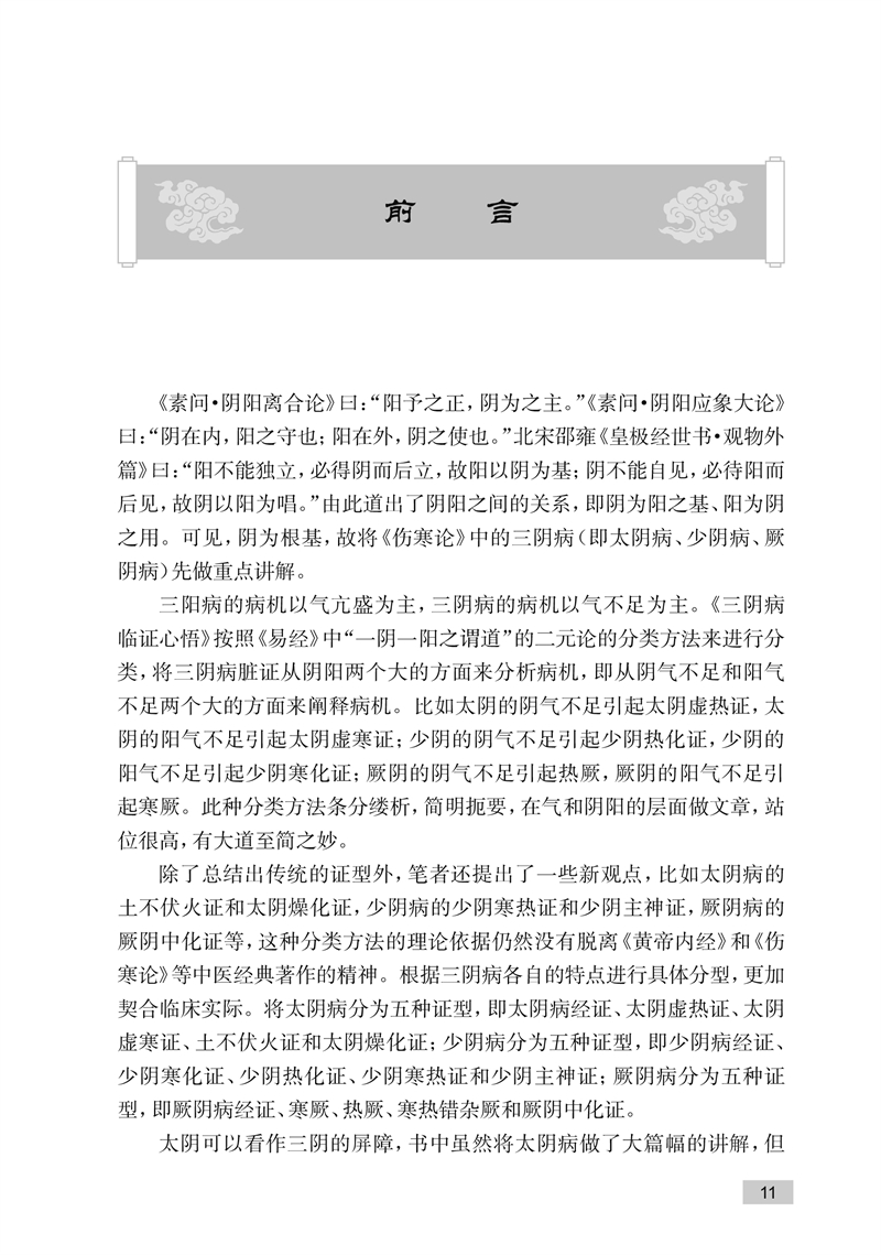 本书共分为医理阐真、太阴病、少阴病、厥阴病和三阴病治验医案举要五章,其中第2~4章主要根据每一病证的精要进行了从病理到诊治的要义阐释,最后一章“三阴病治验医案举要”则主要从尿失禁案、慢性胃肠炎案、病毒性心肌炎案、发热案、肝脓肿案、癫痫案三则、颈椎病案等方面呈现了具体的诊治病例,旨在将三阴病中涉及的相关病案作一详细解读。书中不乏临床经验,也有引经据典的病理阐释,更有作者的用药、养生心得等内容。书中将从三阴病按照“一阴一阳之谓道”的分类方法,从阴阳两个大的方面来分析病机,即从阴气不足和阳气不足两个大的方面来阐释病机。比如太阴的阴气不足引起太阴虚热证,太阴的阳气不足引起太阴虚寒证;少阴的阴气不足引起少阴热化证,少阴的阳气不足引起少阴寒化证,少阴的阴气和阳气均不足引起少阴寒热证;厥阴的阴气不足引起热厥,厥阴的阳气不足引起寒厥,厥阴的阴气和阳气均不足引起寒热错杂厥。这种分类方法的优点就是条分缕析,在气和阴阳的层面做文章,有大道至简之妙。