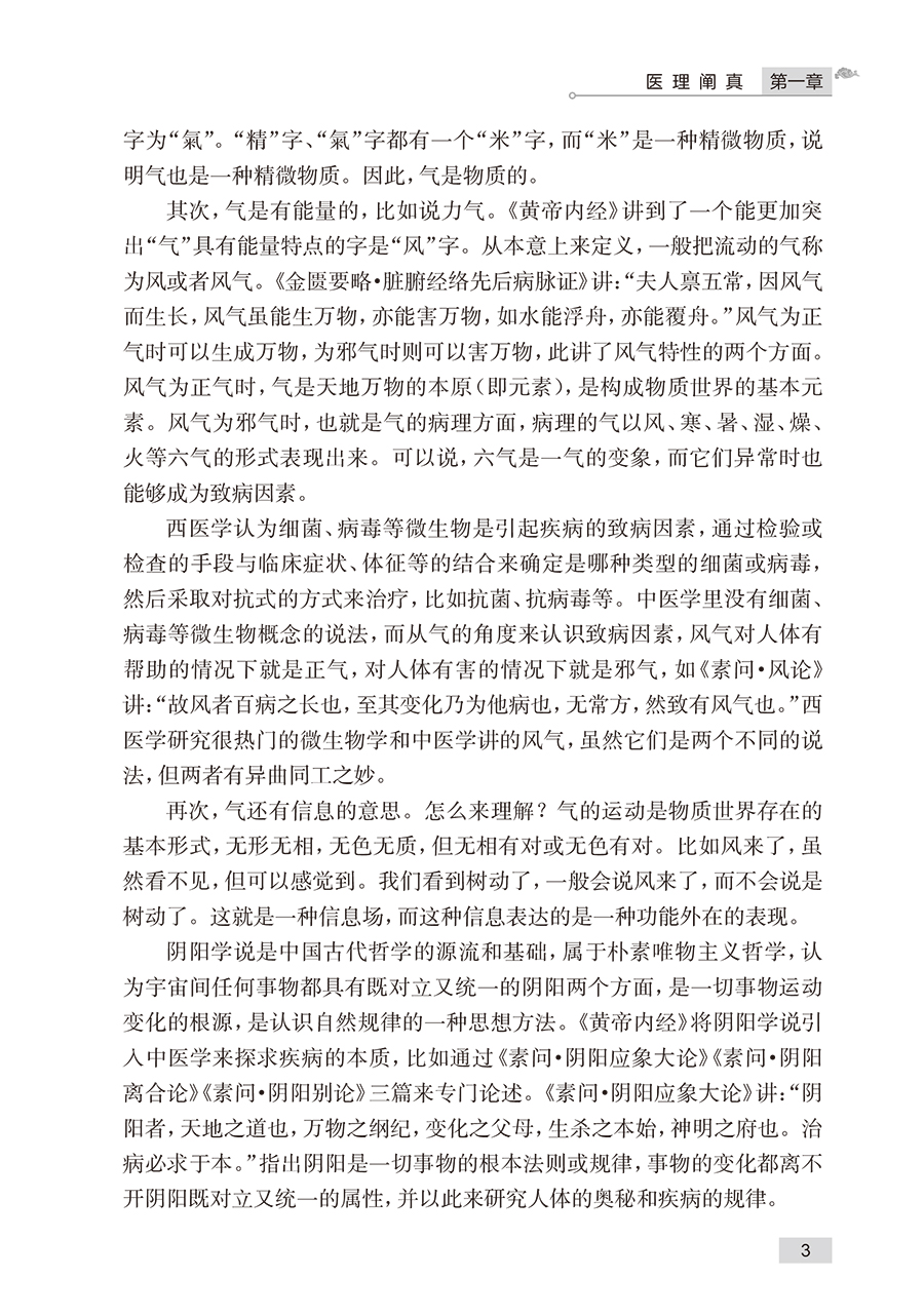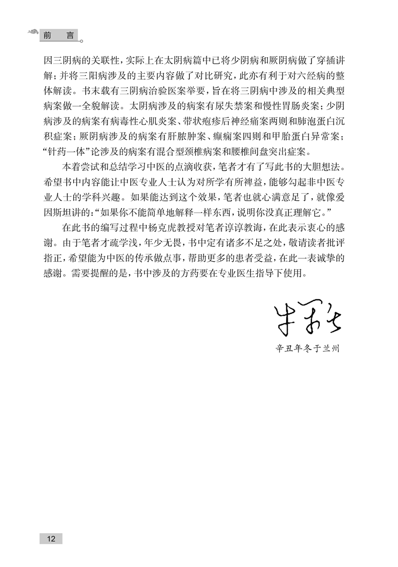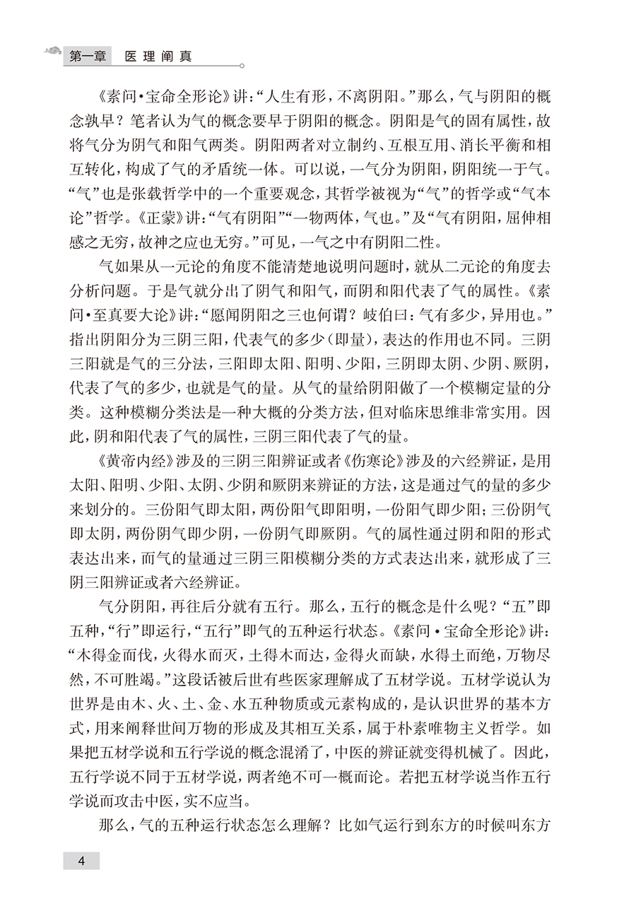 本书共分为医理阐真、太阴病、少阴病、厥阴病和三阴病治验医案举要五章,其中第2~4章主要根据每一病证的精要进行了从病理到诊治的要义阐释,最后一章“三阴病治验医案举要”则主要从尿失禁案、慢性胃肠炎案、病毒性心肌炎案、发热案、肝脓肿案、癫痫案三则、颈椎病案等方面呈现了具体的诊治病例,旨在将三阴病中涉及的相关病案作一详细解读。书中不乏临床经验,也有引经据典的病理阐释,更有作者的用药、养生心得等内容。书中将从三阴病按照“一阴一阳之谓道”的分类方法,从阴阳两个大的方面来分析病机,即从阴气不足和阳气不足两个大的方面来阐释病机。比如太阴的阴气不足引起太阴虚热证,太阴的阳气不足引起太阴虚寒证;少阴的阴气不足引起少阴热化证,少阴的阳气不足引起少阴寒化证,少阴的阴气和阳气均不足引起少阴寒热证;厥阴的阴气不足引起热厥,厥阴的阳气不足引起寒厥,厥阴的阴气和阳气均不足引起寒热错杂厥。这种分类方法的优点就是条分缕析,在气和阴阳的层面做文章,有大道至简之妙。