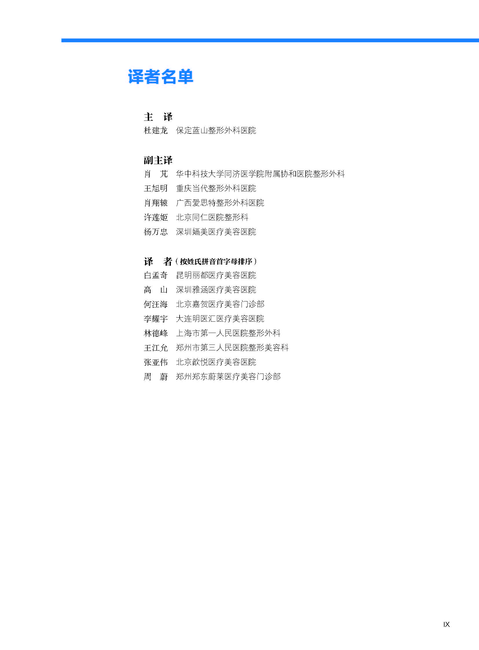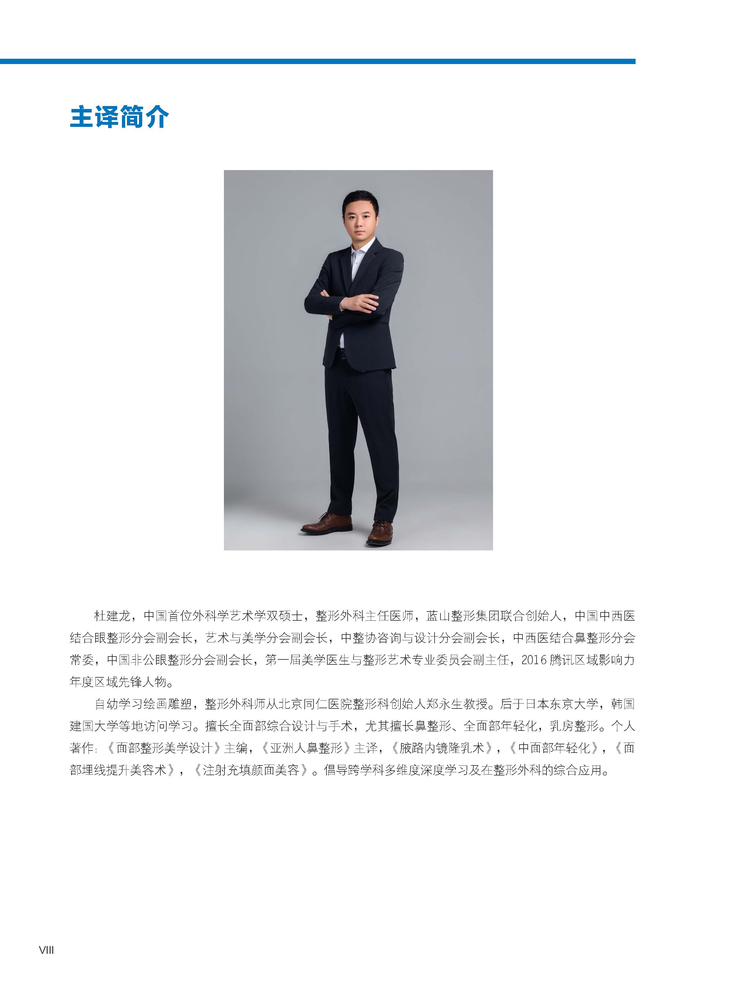 主编:(韩)徐万群,韩国整形外科医生,知名鼻整形专家。主译:杜建龙,中国首位外科学艺术学双硕士,整形外科主任医师,蓝山整形集团联合创始人,中国中西医结合眼整形分会副会长,艺术与美学分会副会长,中整协咨询与设计分会副会长,中西医结合鼻整形分会常委,中国非公眼整形分会副会长,第一届美学医生与整形艺术专业委员会副主任,2016腾讯区域影响力年度区域先锋人物。自幼学习绘画雕塑,整形外科师从北京同仁医院整形科创始人郑永生教授。后于日本东京大学,韩国建国大学等地访问学习。擅长全面部综合设计与手术,尤其擅长鼻整形、全面部年轻化,乳房整形。个人著作:《面部整形美学设计》主编,《亚洲人鼻整形》主译,《腋路内镜隆乳术》,《中面部年轻化》,《面部埋线提升美容术》,《注射充填颜面美容》。倡导跨学科多维度深度学习及在整形外科的综合应用。