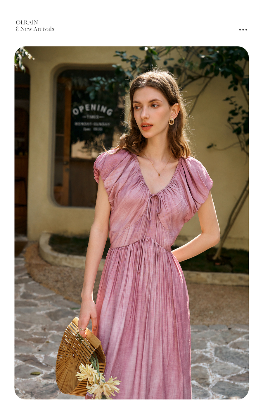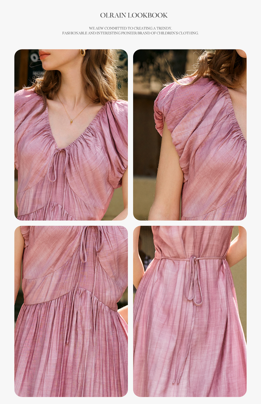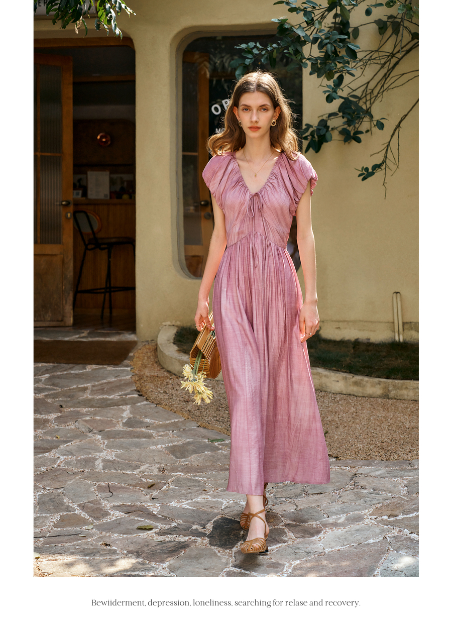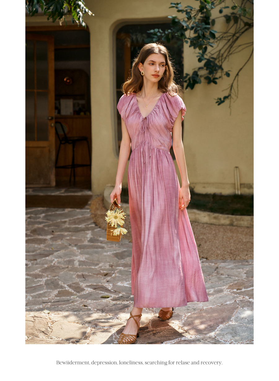 OLrain欧芮儿粉色V领收腰显瘦晕染连衣裙女夏季2025新款甜美长裙