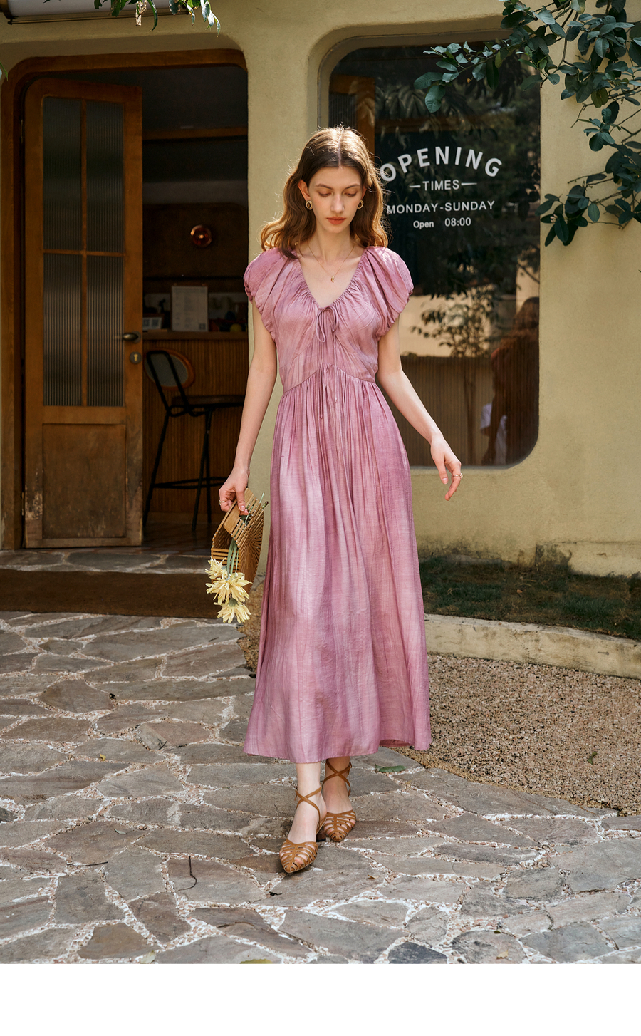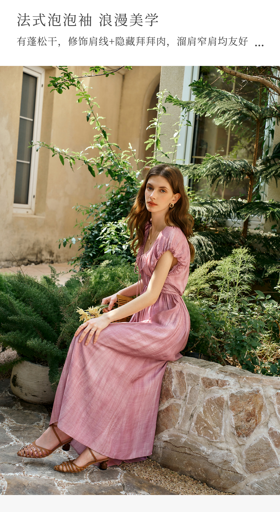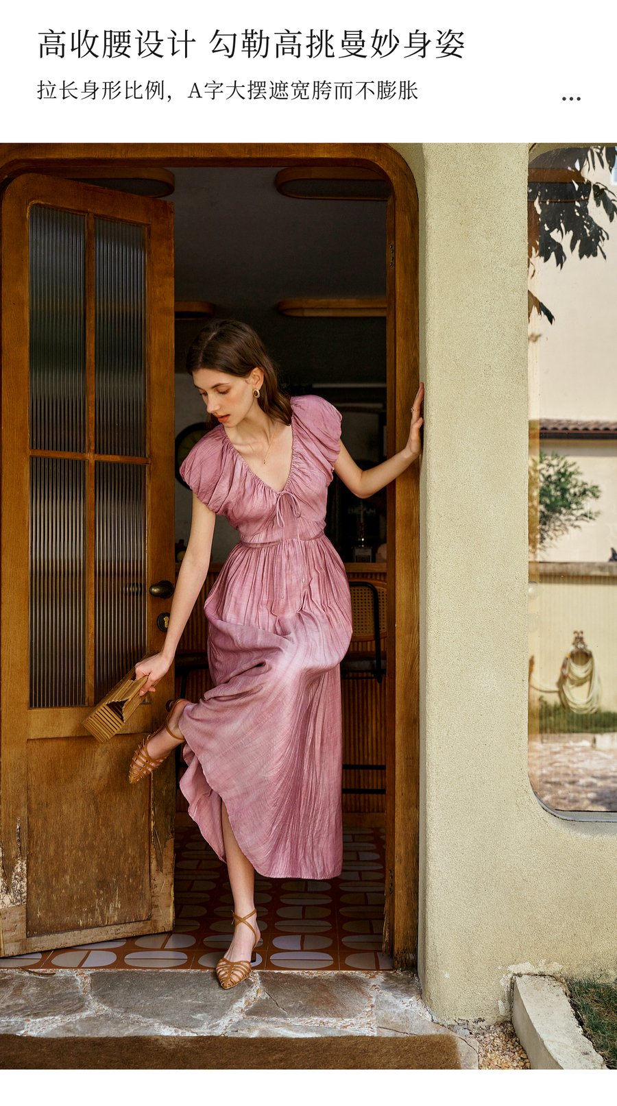 OLrain欧芮儿粉色V领收腰显瘦晕染连衣裙女夏季2025新款甜美长裙