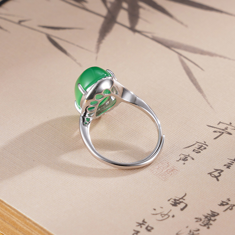 【寓意】:戒指镶嵌绿玉髓,搭配锆石密嵌,整体色调和谐,如春风过境,清新秀雅,意趣盎然。