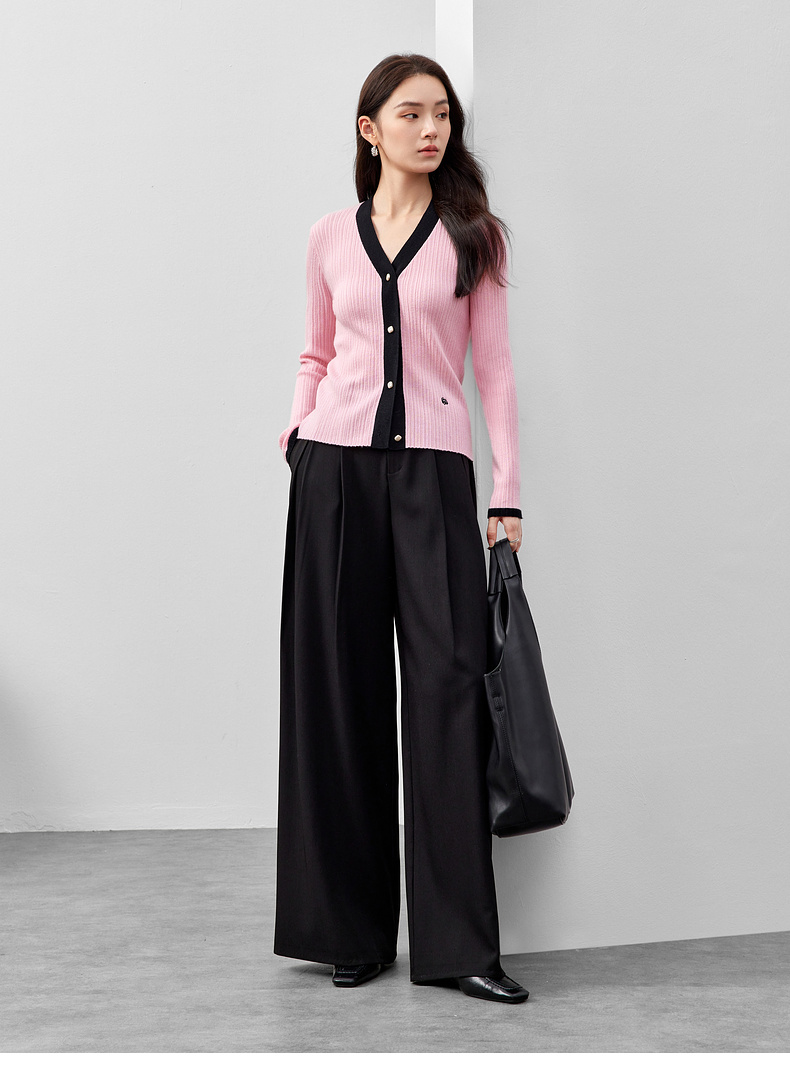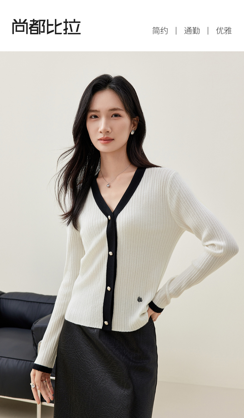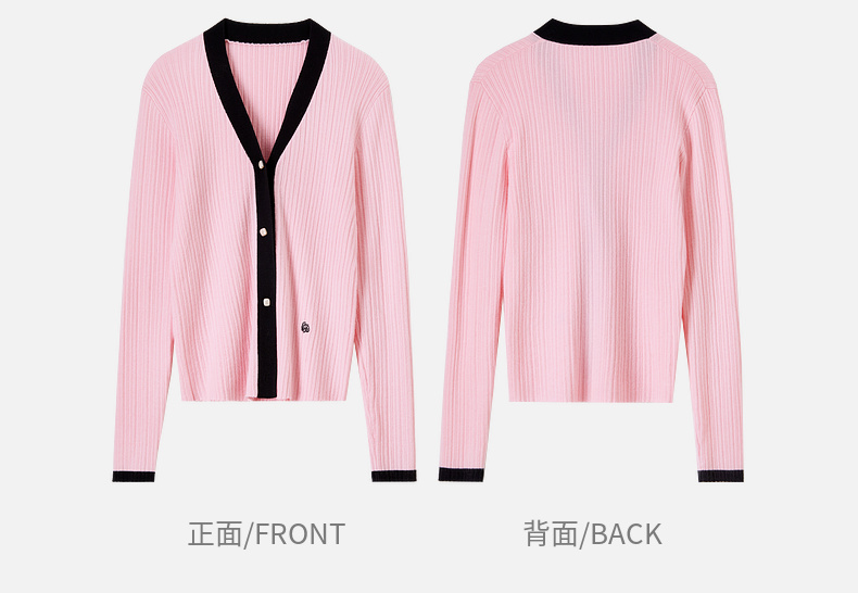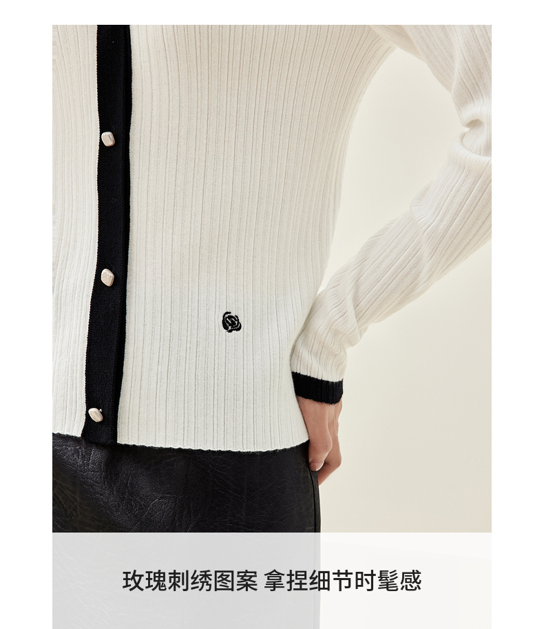 【内购】通勤轻奢撞色V领玫瑰刺绣含45支高原羊毛高弹修身显瘦毛针织开衫-W51H58341