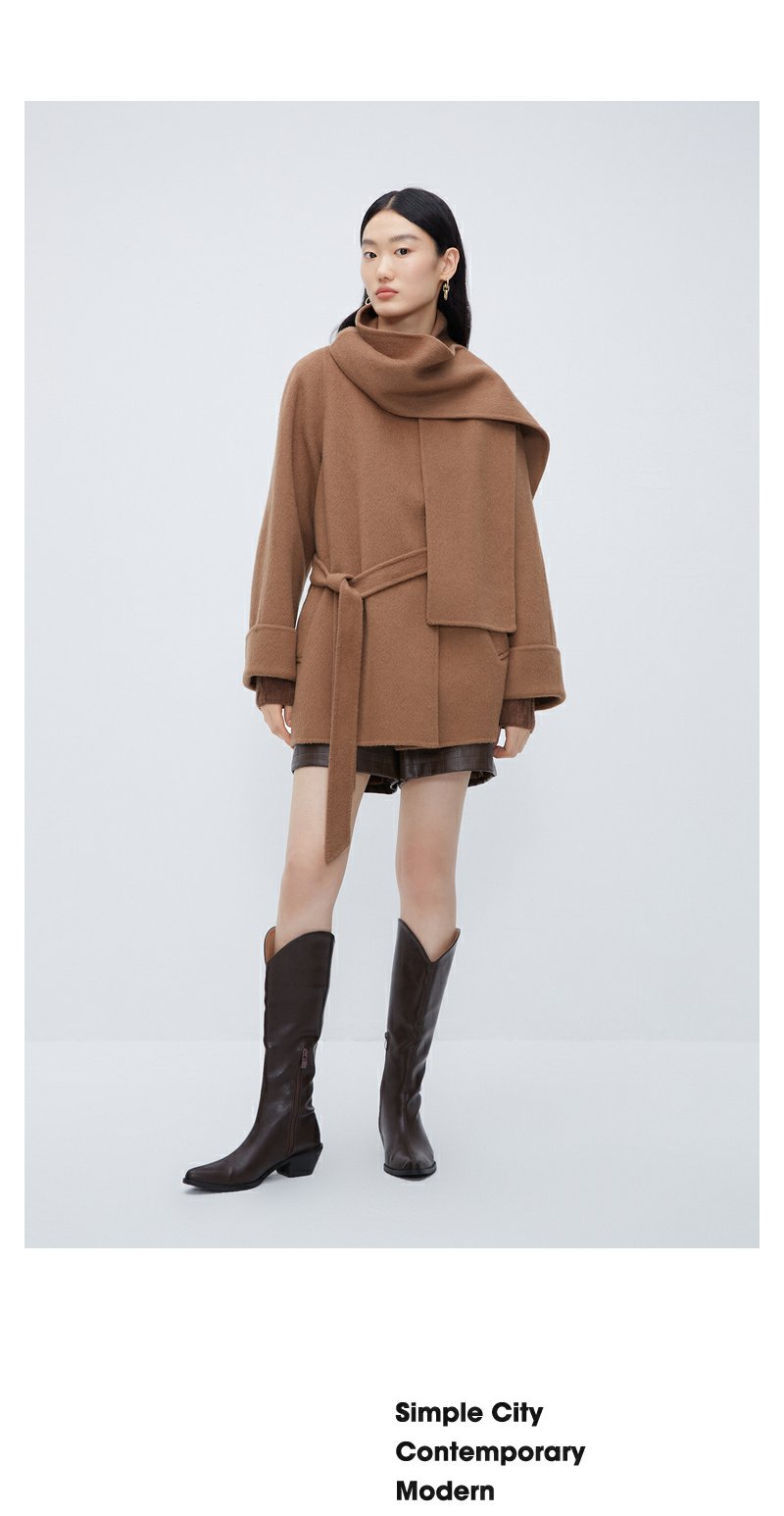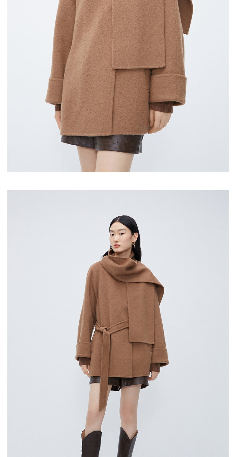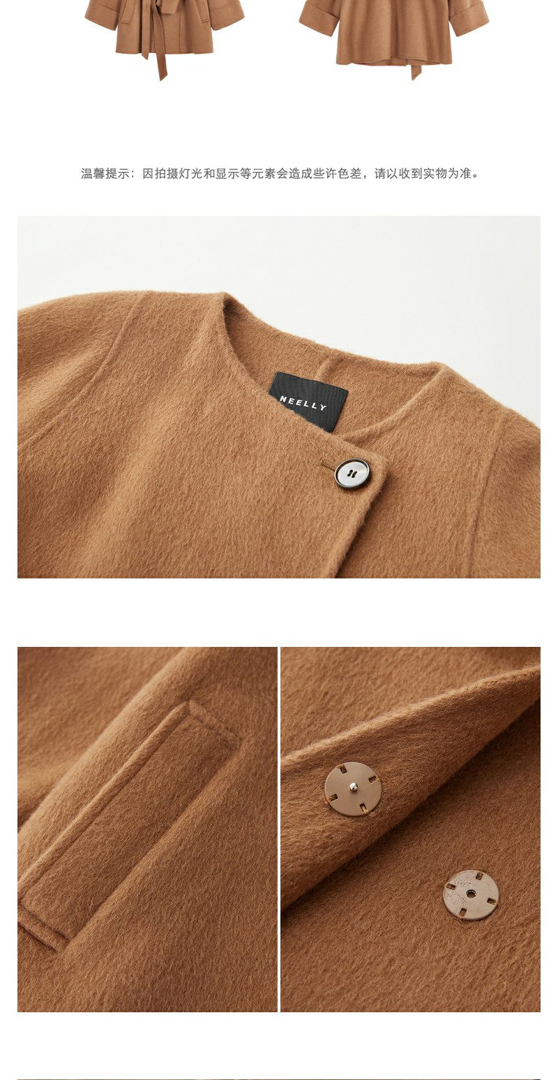 NEELLY纳俪商场同款可拆卸围巾领大衣女冬驼色短款双面呢羊毛外套N23105N01110