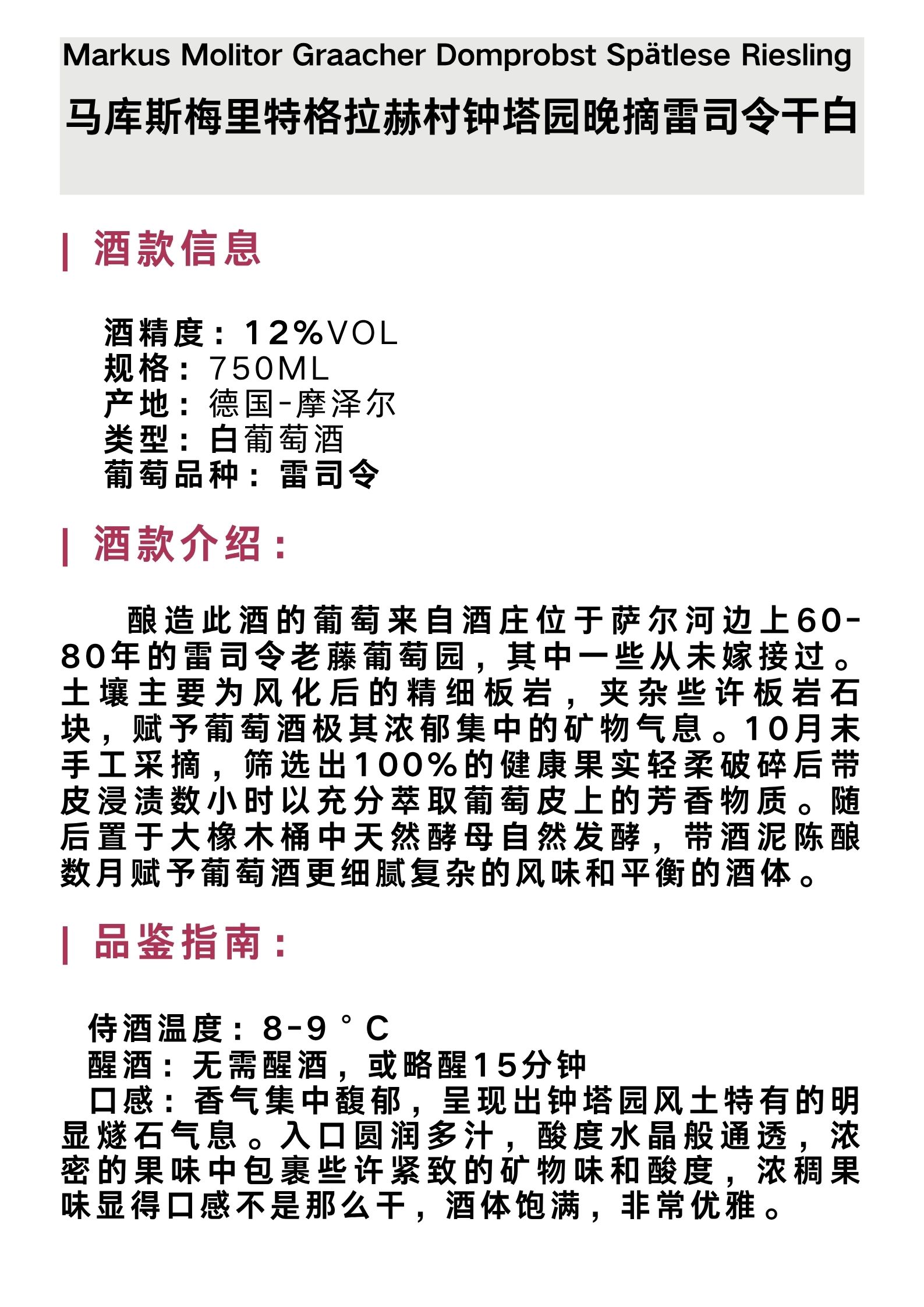马库斯梅里特格拉赫村钟塔园晚摘雷司令⼲⽩葡萄酒 Markus Molitor Graacher Domprobst Spätlese Riesling