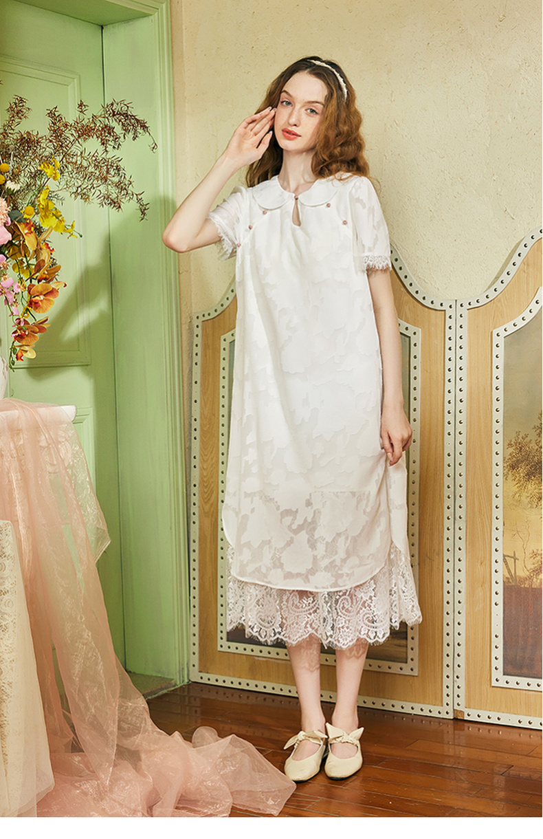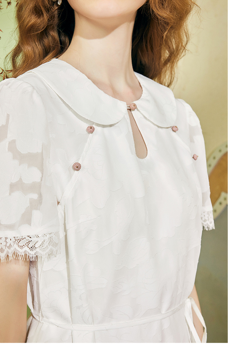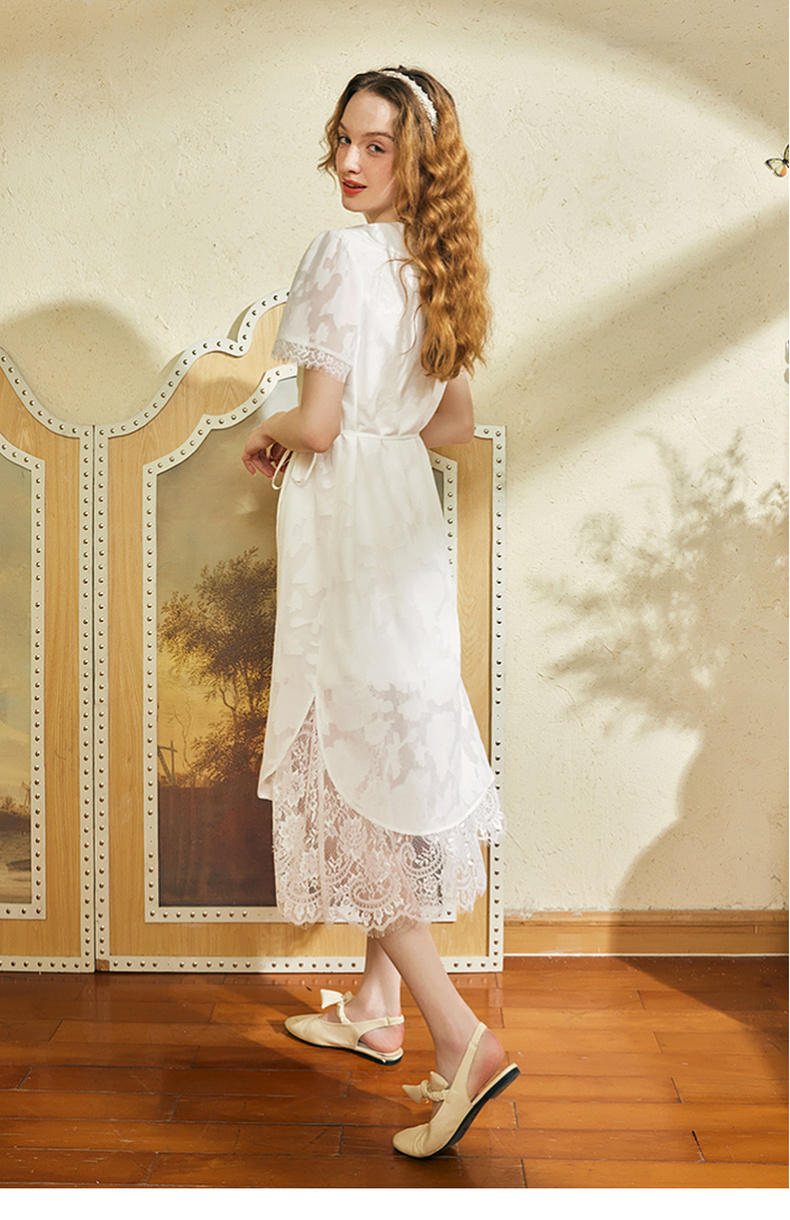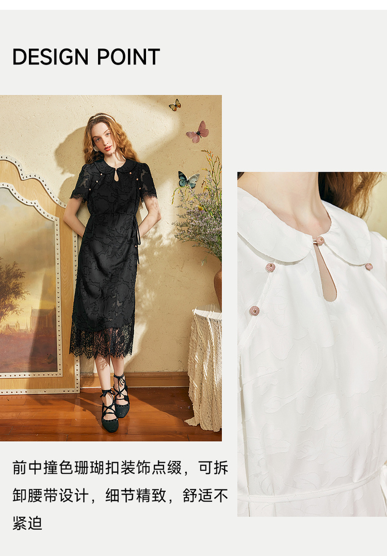 两三事 玉容清影 2024夏季新款新中式蕾丝拼接旗袍裙翻领连衣裙