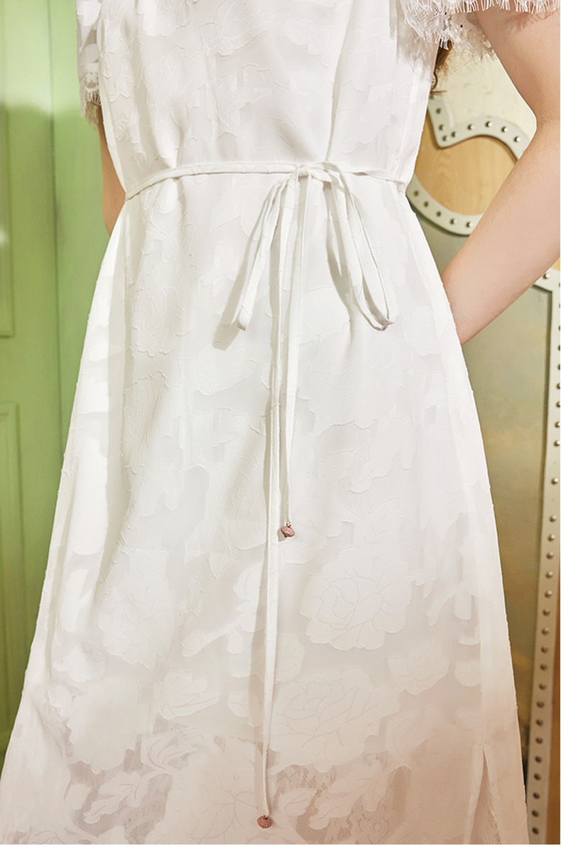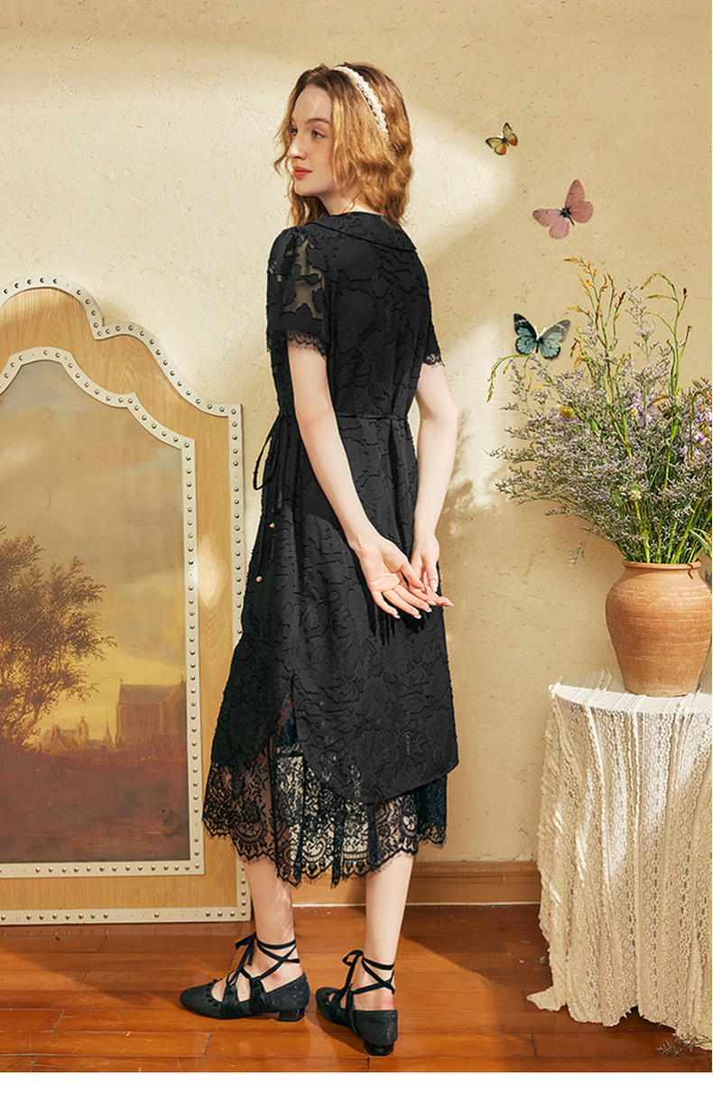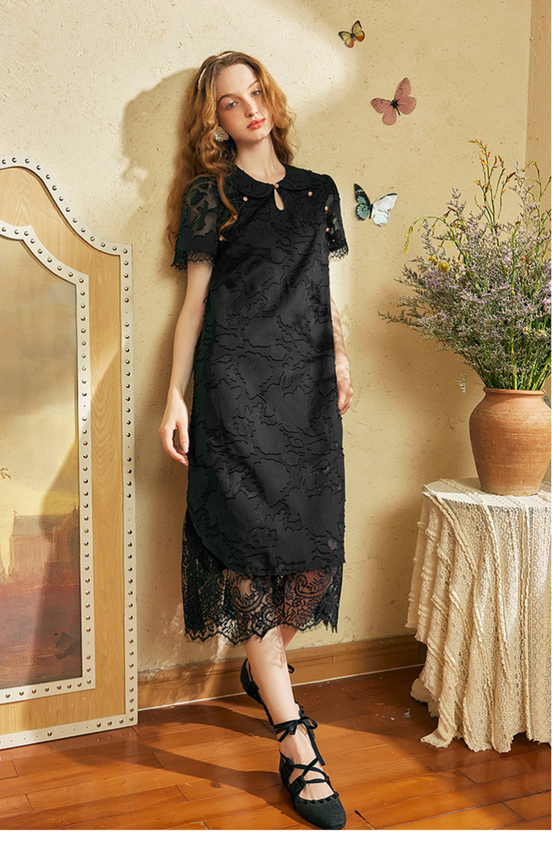 两三事 玉容清影 2024夏季新款新中式蕾丝拼接旗袍裙翻领连衣裙
