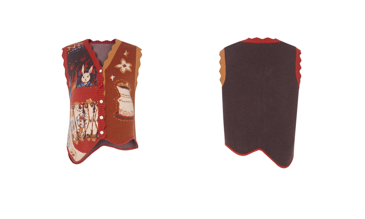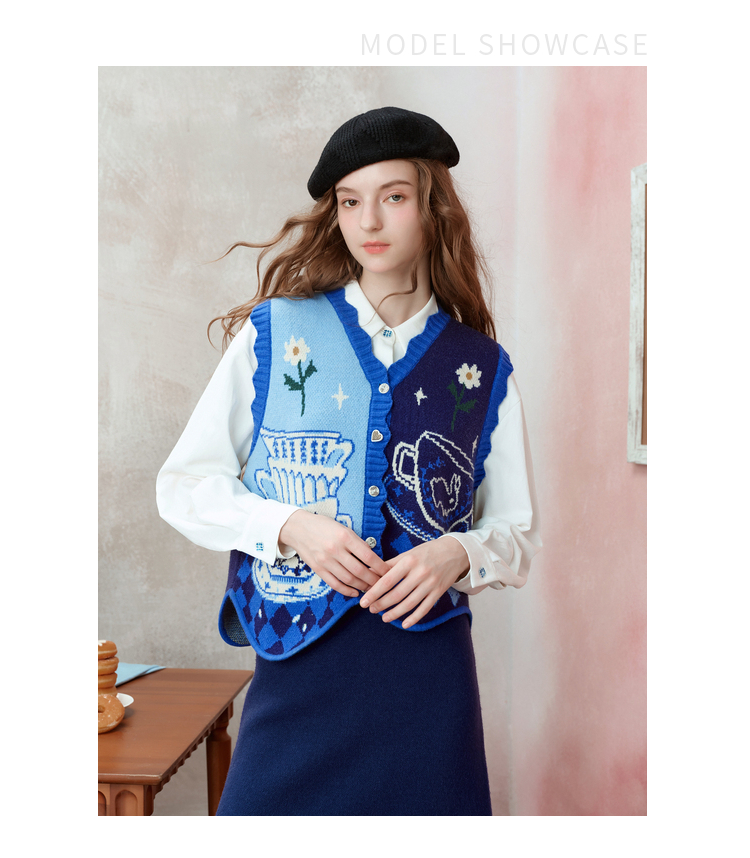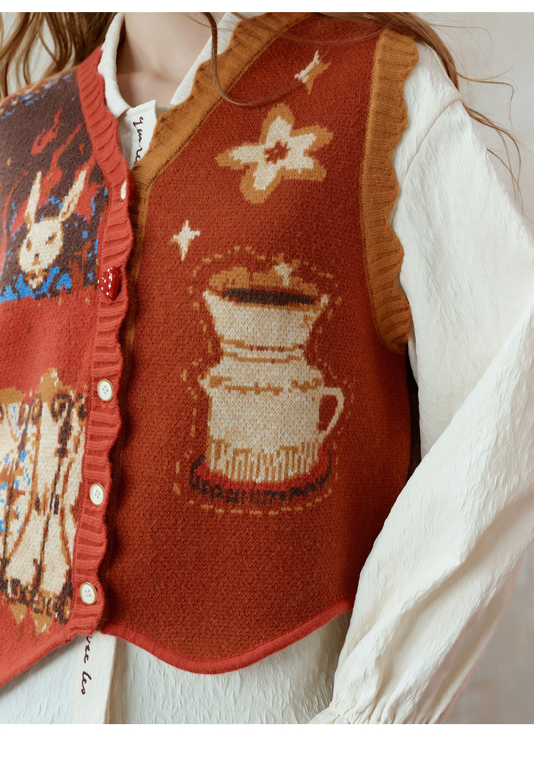 两三事梵高文艺奇迹童话镇2025冬季新款不对称波浪下摆花色马甲女