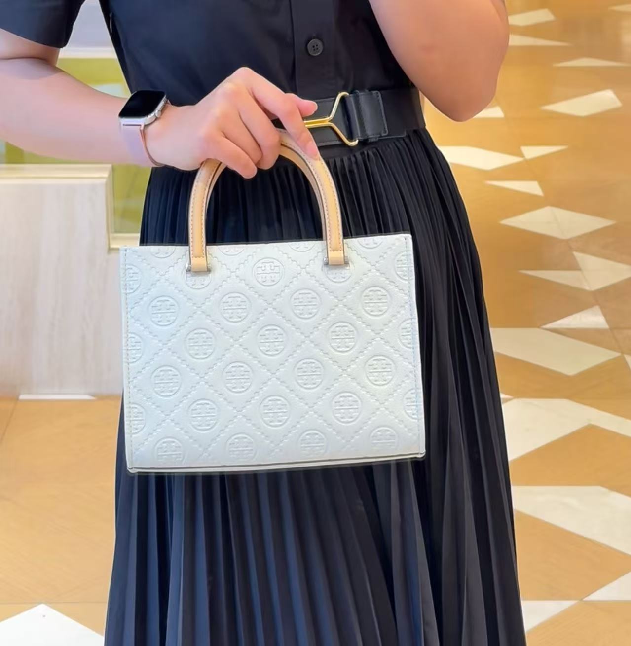 TORY BURCH 汤丽柏琦 T MONOGRAM 手提压花托特包女包 169269,经典 T Monogram 图案,搭配压花皮革。魅力隽永又风格独具。TMonogram 手提托特包,配有可拆卸斜挎背带。更以柔软纤细的绒面皮革打造包袋内里,内设口袋,方便有序收纳。每个细节均经过精心考究,尤其注重功能性与多样性的结合。