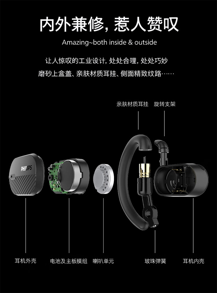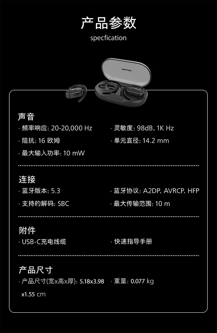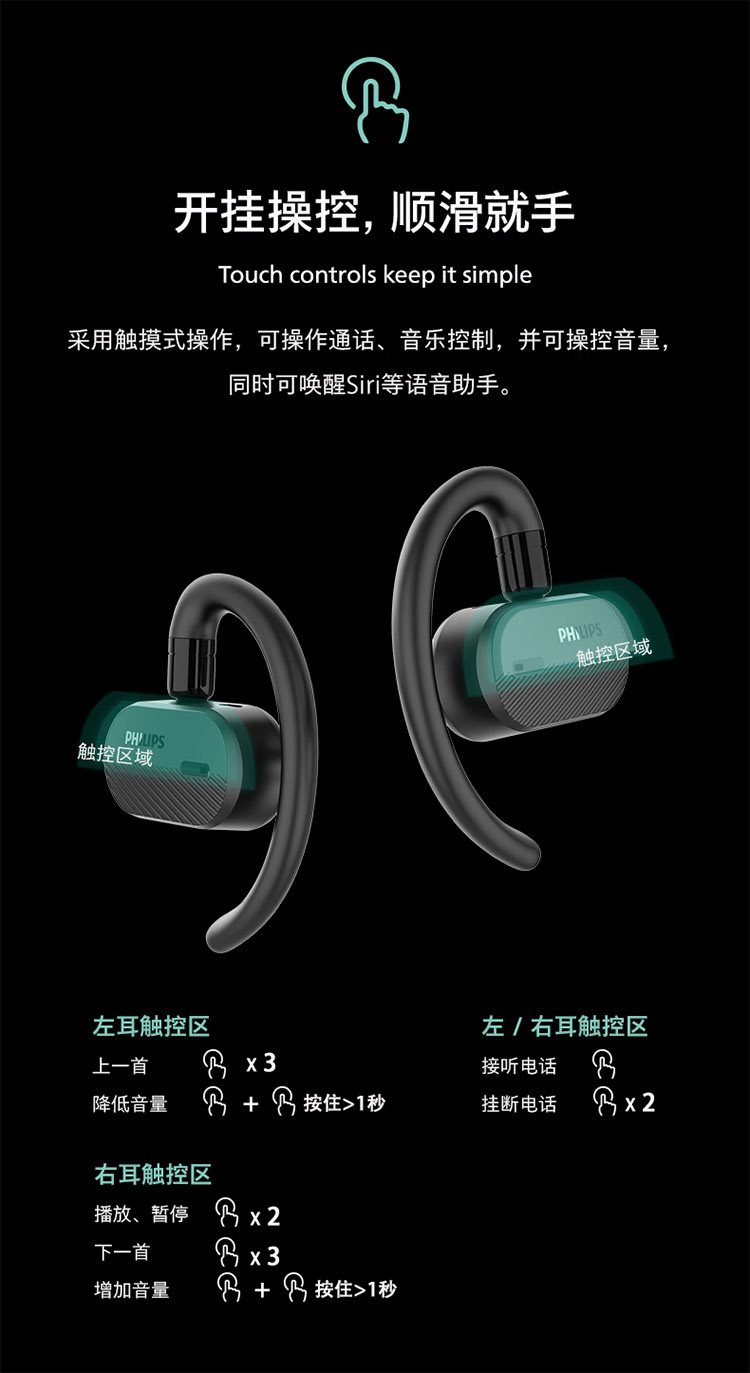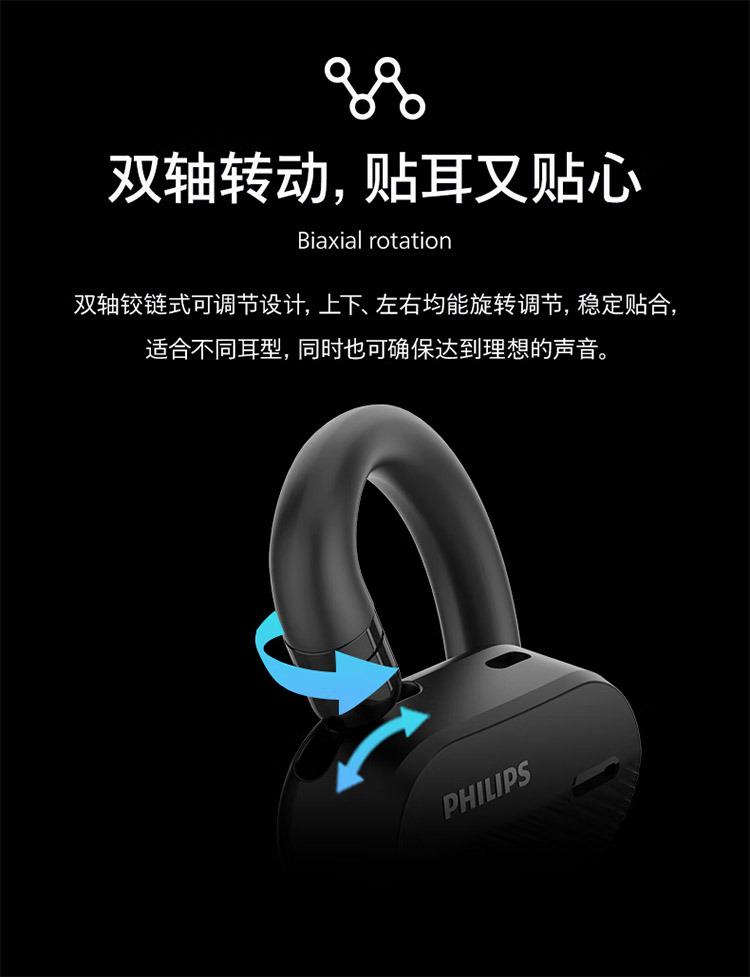 飞利浦不入耳开放式运动耳机真无线蓝牙耳机挂耳式跑步商务耳麦TAA6708