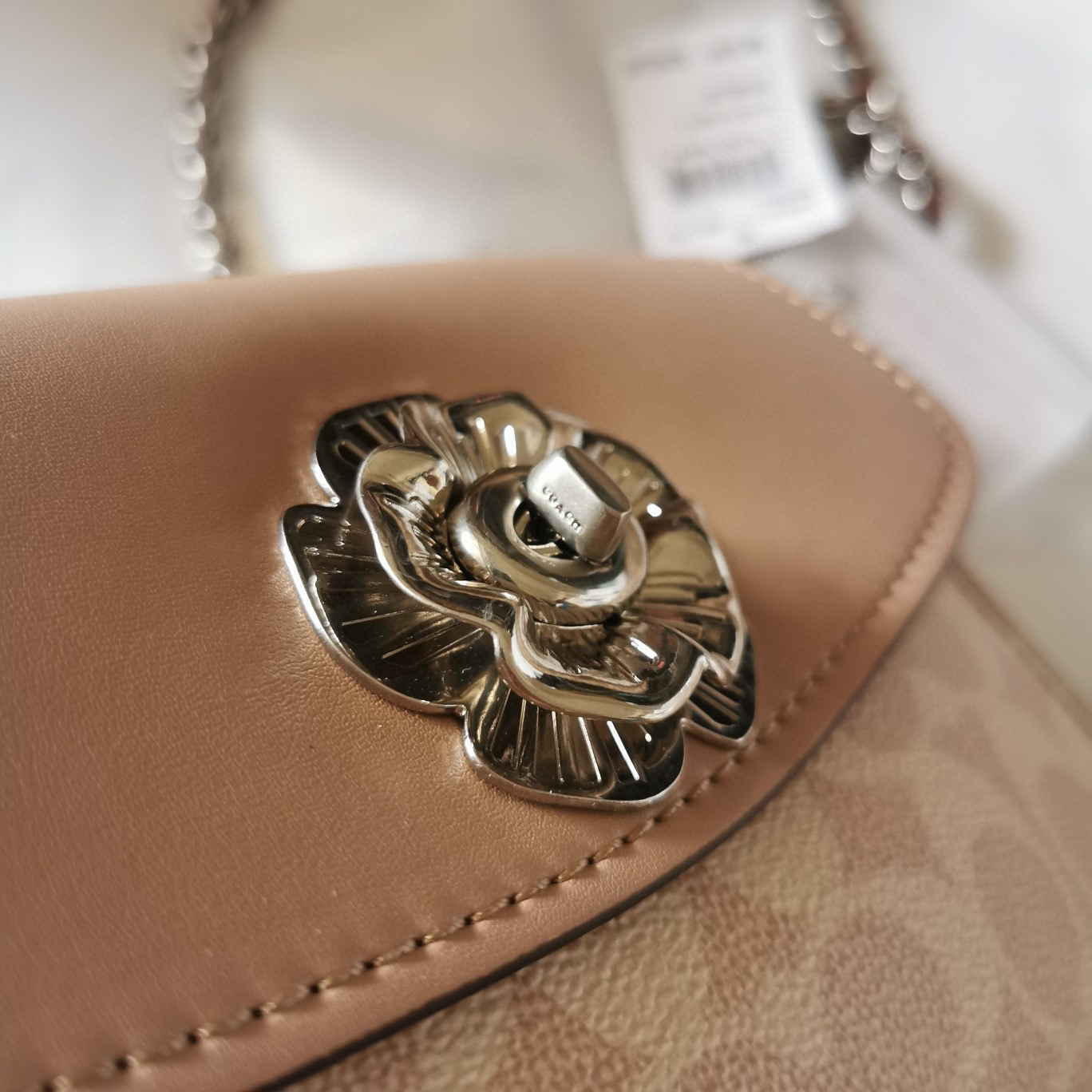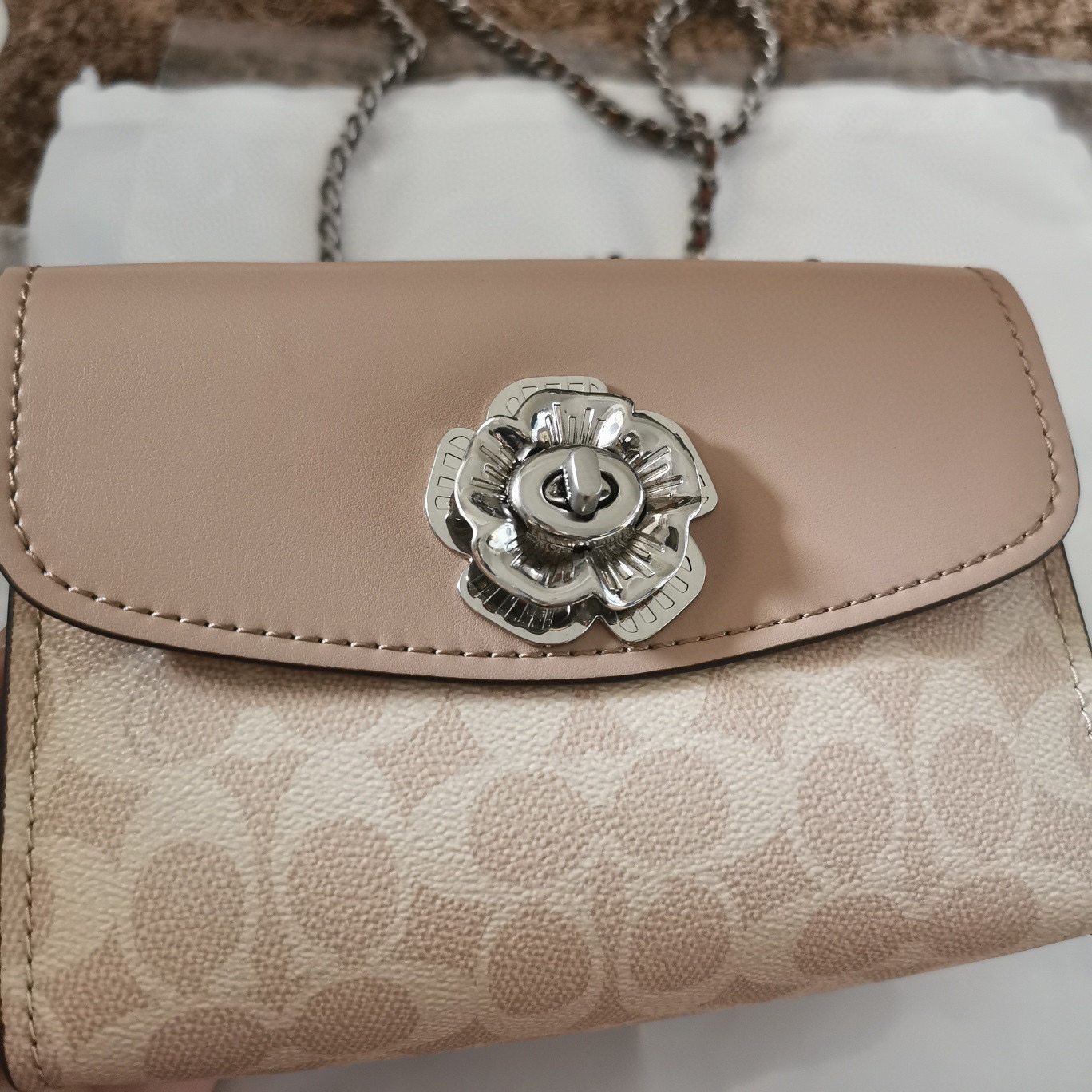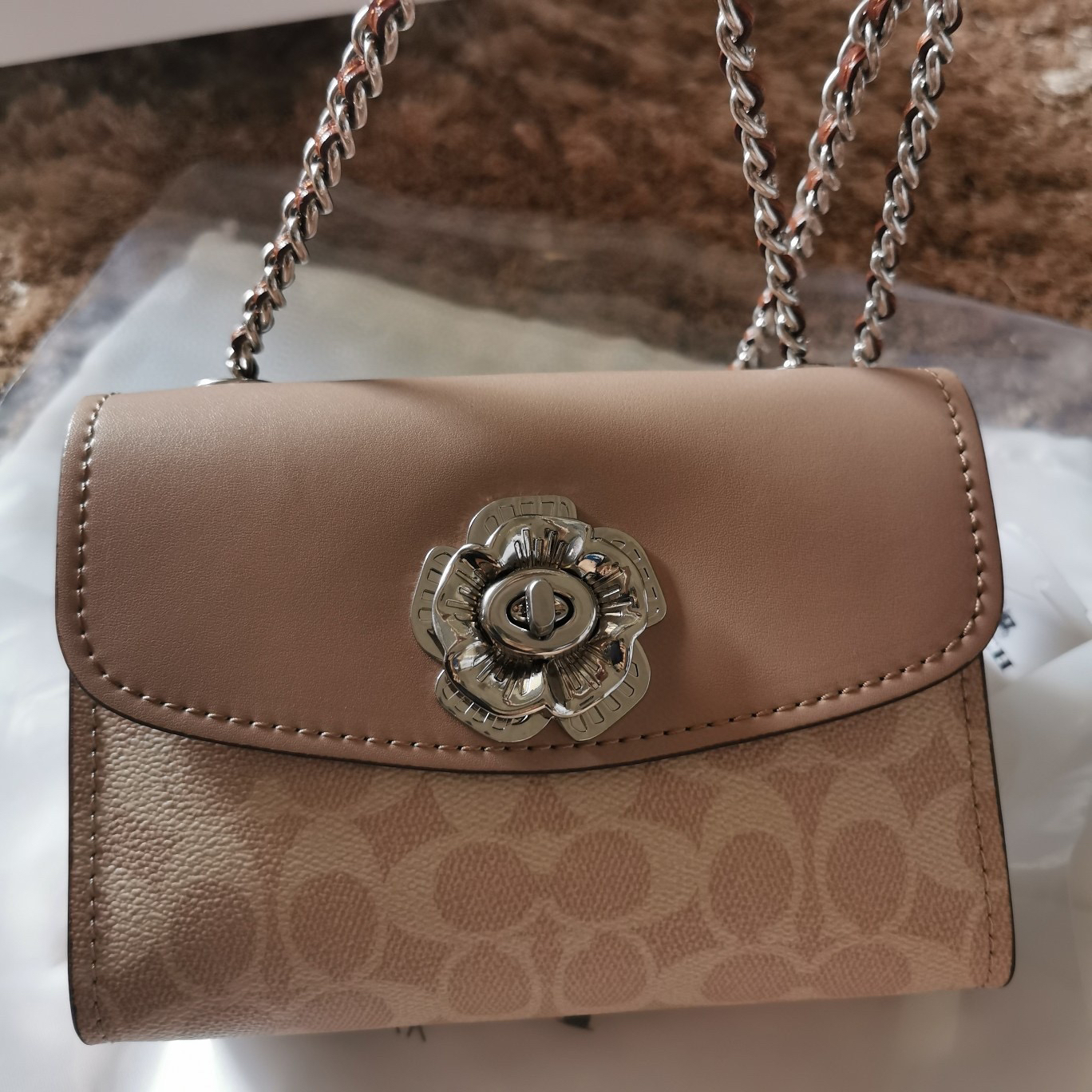 蔻驰的山茶花列系一直么这火😍肩带是皮链拼条的加更洋气时髦 手可提以变长成肩带 外部开口放袋 平喜时欢斜挎 单肩背的候时把肩带上收去就以可了~