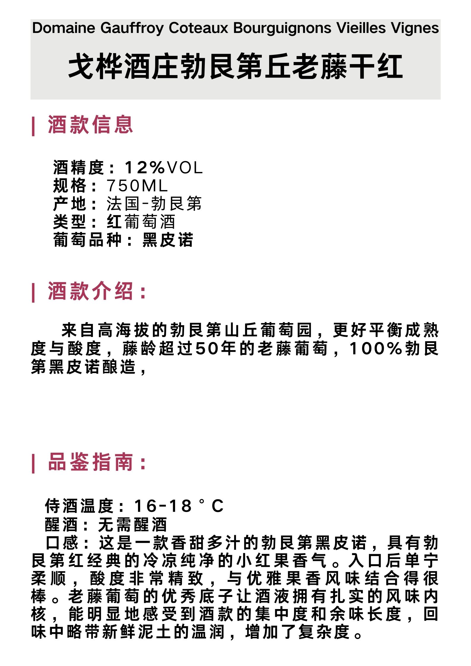 戈桦勃艮第丘老藤干红葡萄酒 Domaine Gauffroy Coteaux Bourguignons Vieilles Vignes