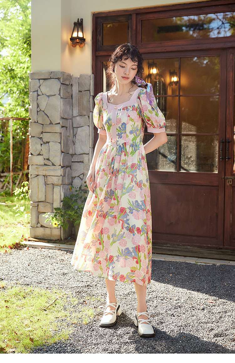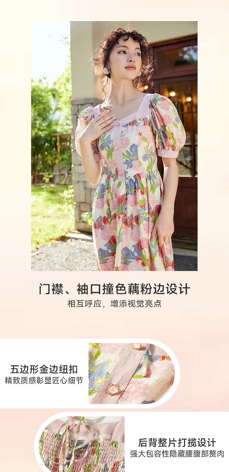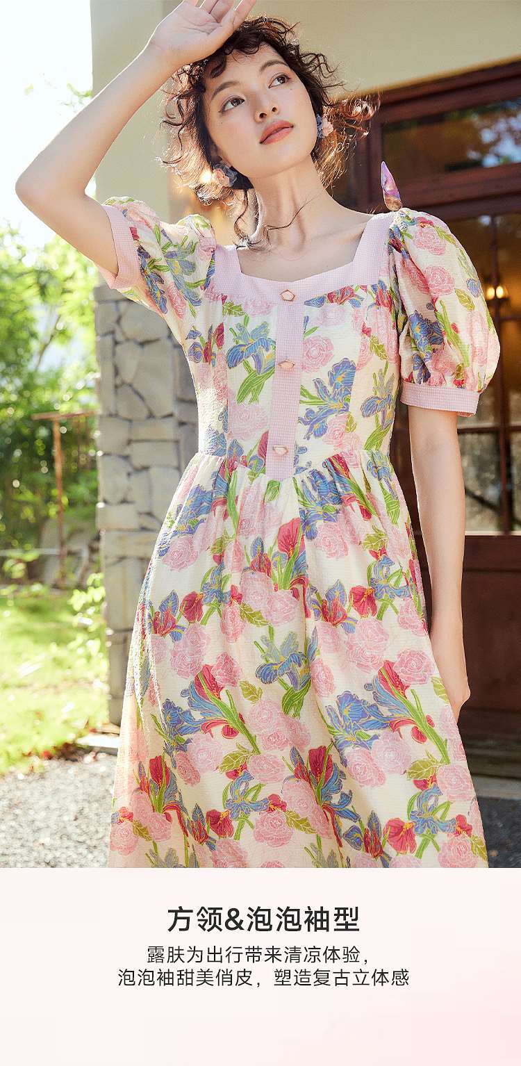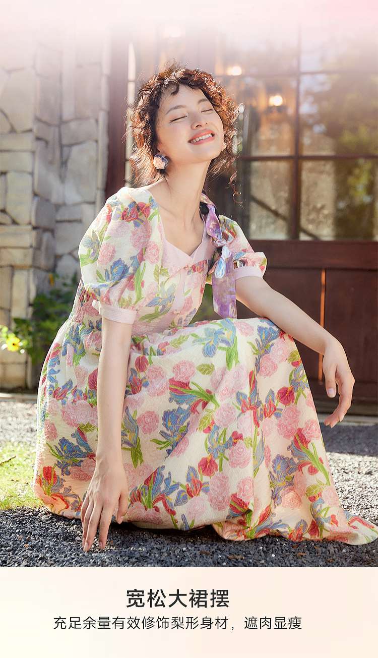 两三事爱的誓言 夏季新款复古印花泡泡袖绑带a字连衣裙