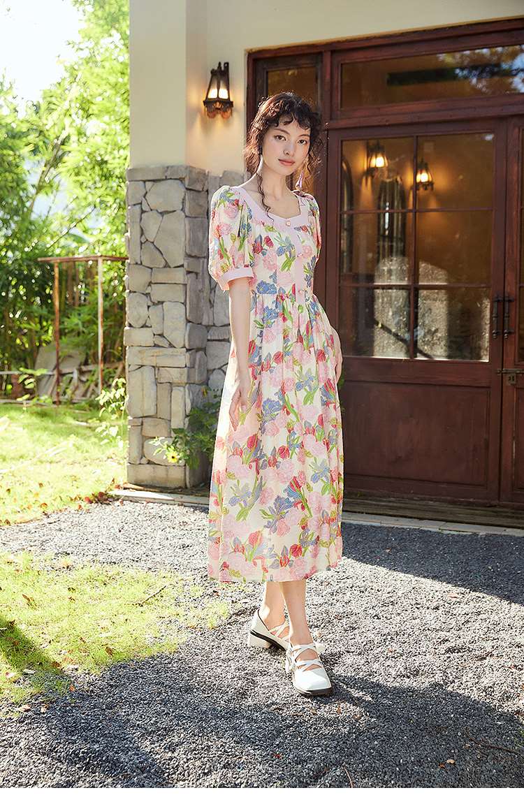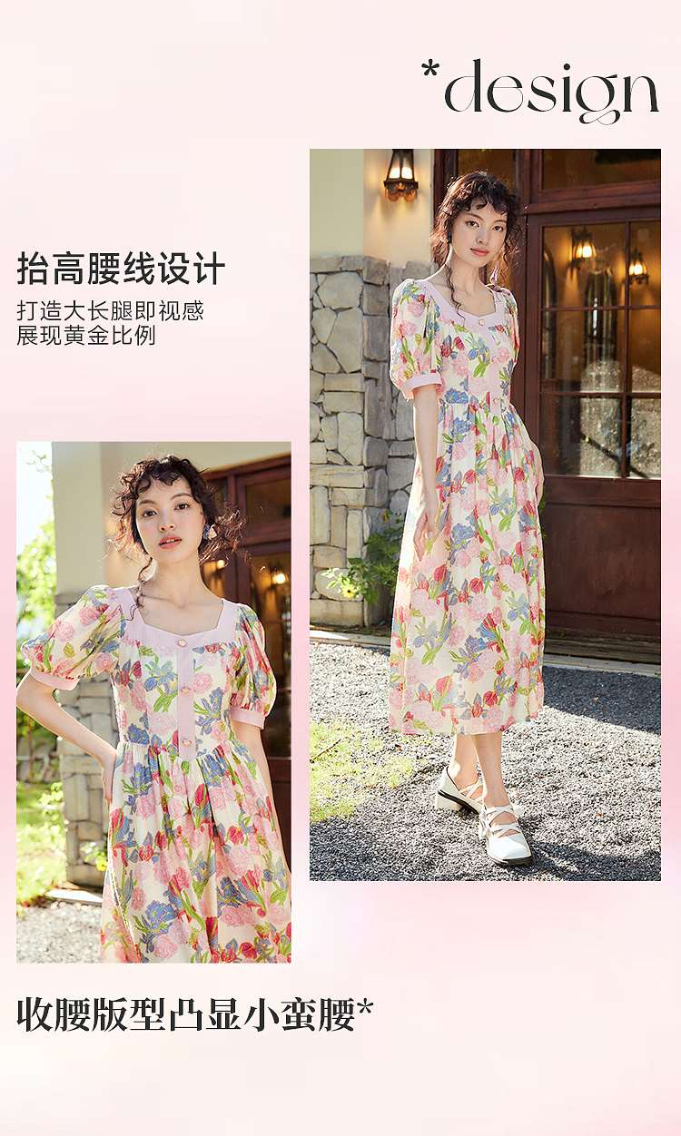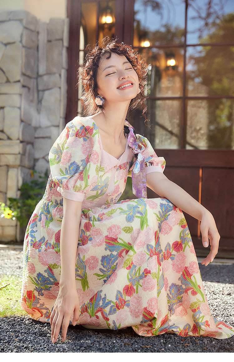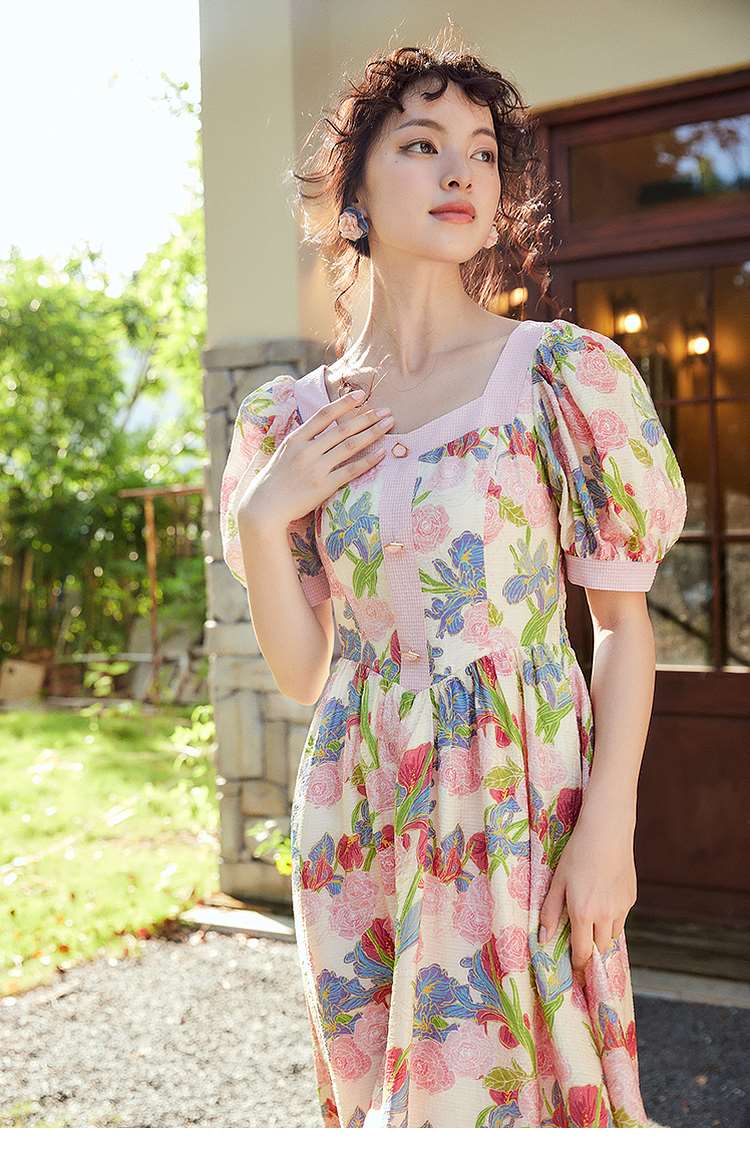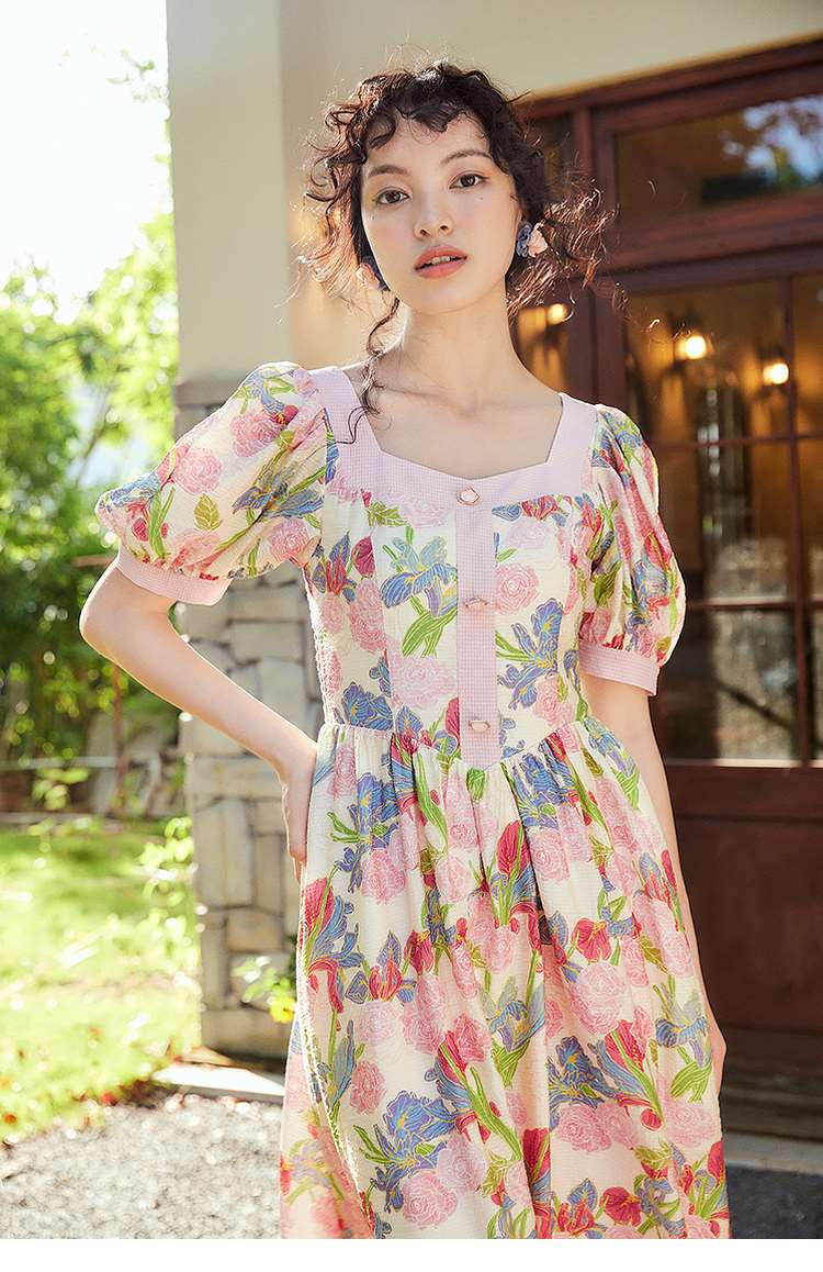 两三事爱的誓言 夏季新款复古印花泡泡袖绑带a字连衣裙