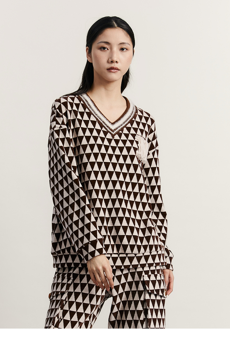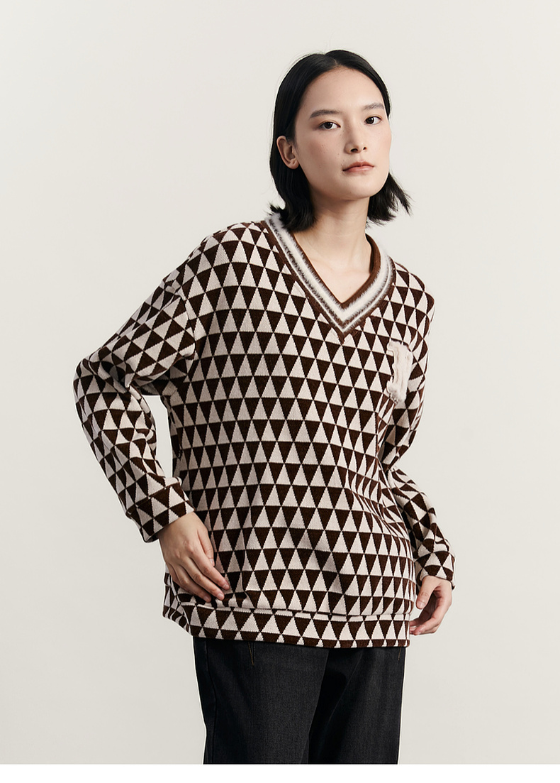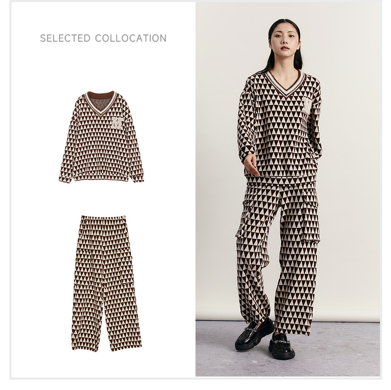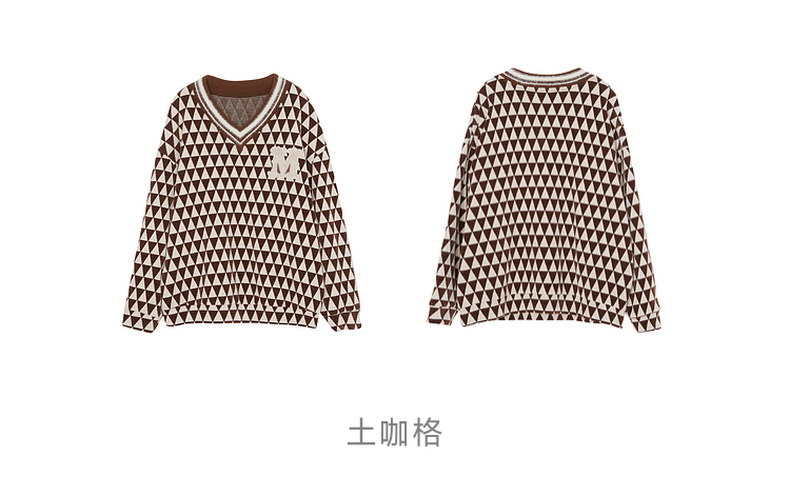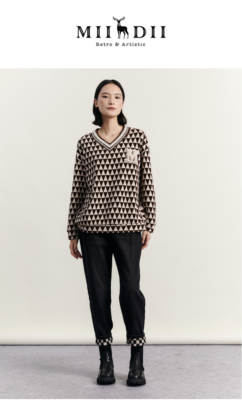 谜底V领套头卫衣女2023冬季新品复古学院风宽松绣花上衣234MV1546