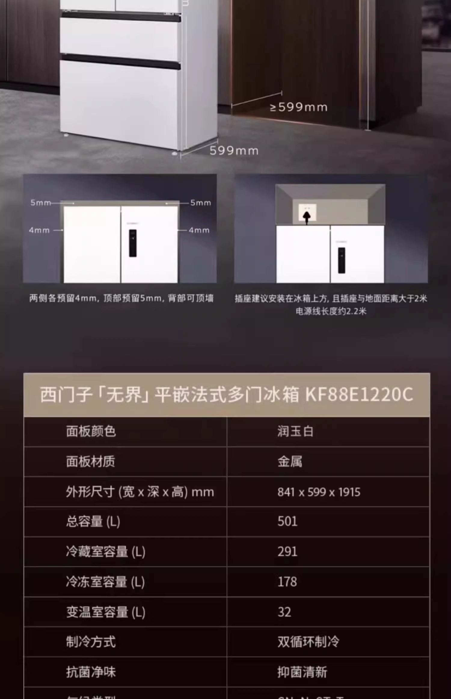 【国补15%】西门子平嵌 501L大容量法式多门 家用变频电冰箱 超薄平嵌 双系统双循环 抑菌清新 变温储鲜 KF88E1220C