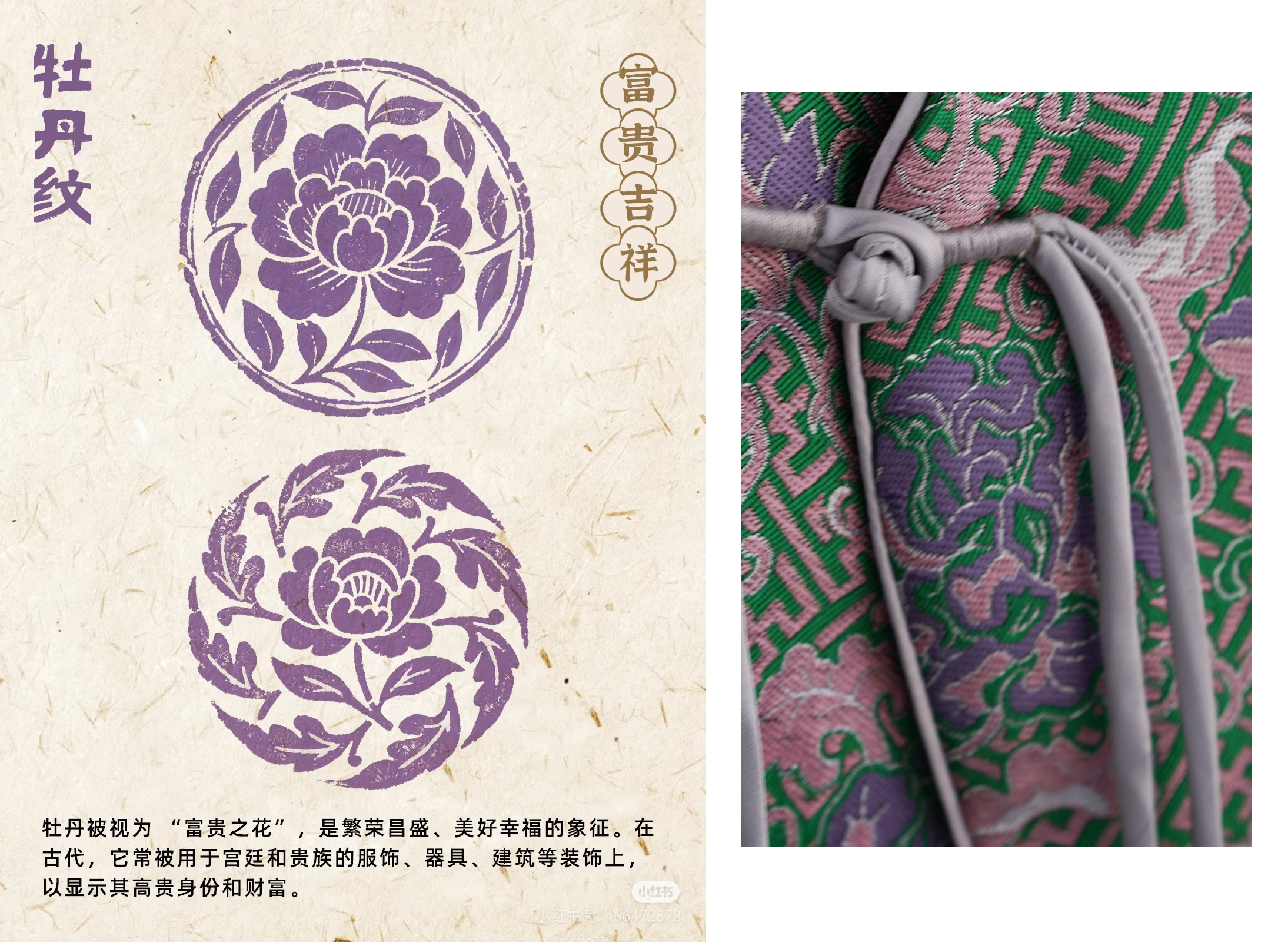 藤萝紫的牡丹花纹样,正如李白诗所云:“紫藤挂云木,花蔓宜阳春,密叶隐歌鸟,香风流美人。”