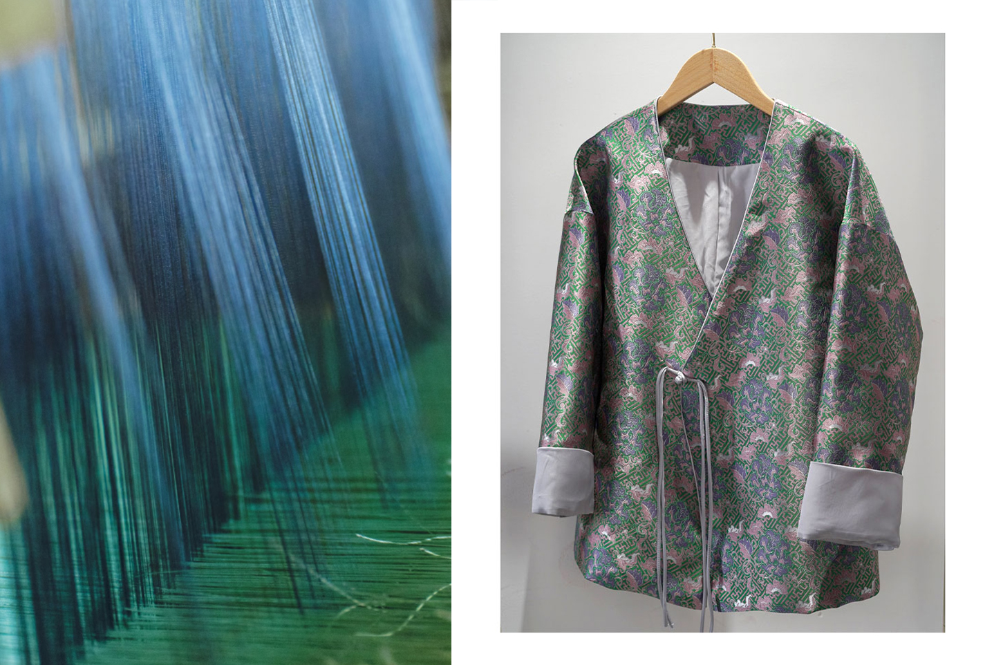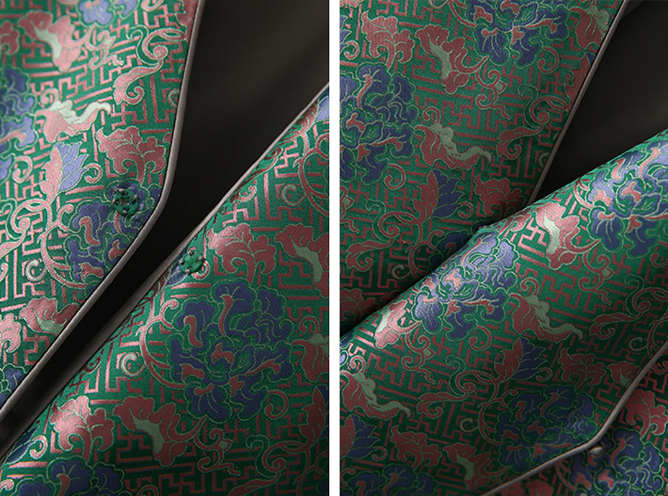 因为使用的是柞蚕丝,宋锦的坚柔让其廓形更挺阔,而穿在身上却能感觉到其柔软,做外套平整挺阔、有型而精致,那是视觉与身体的双重感知。
