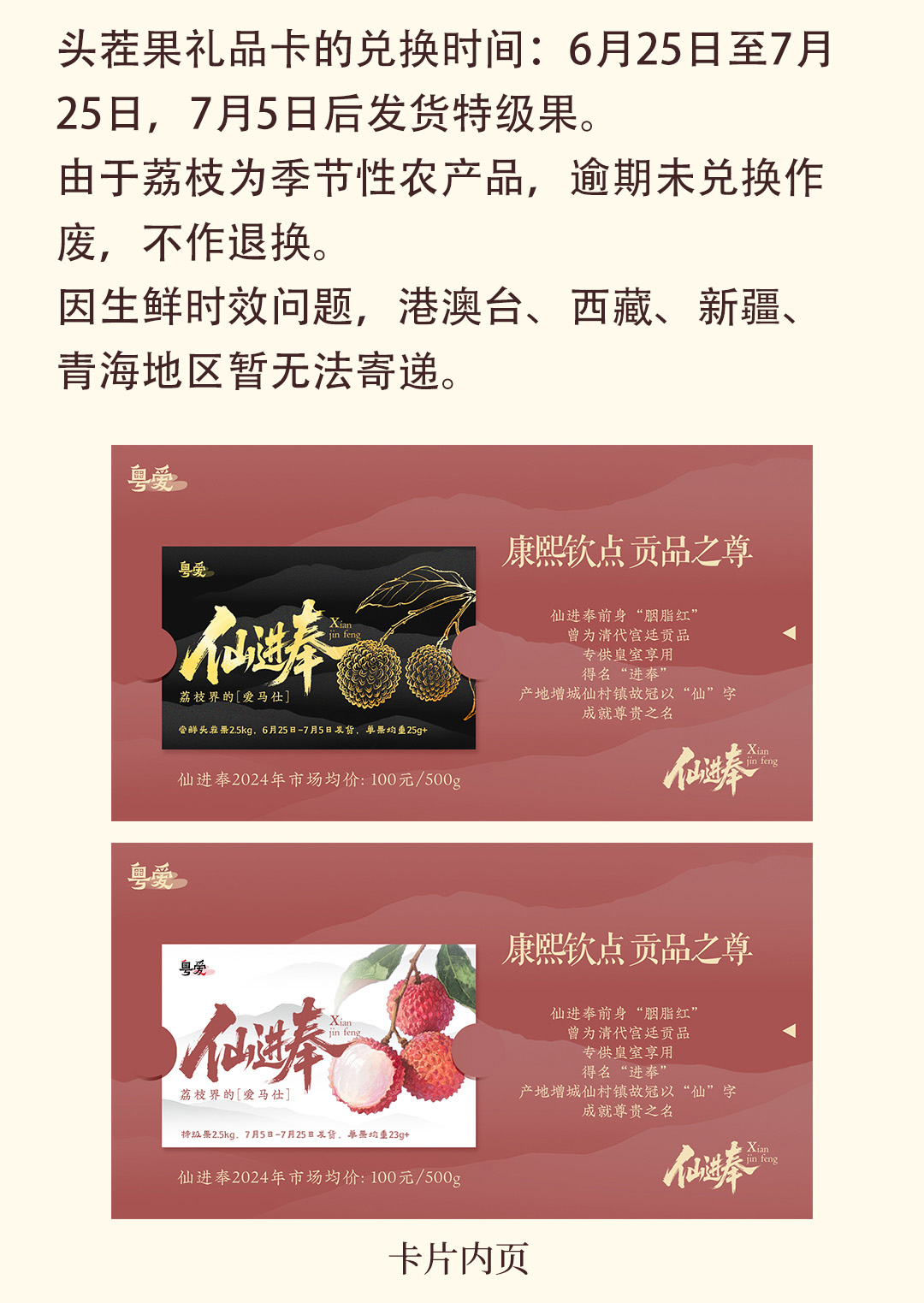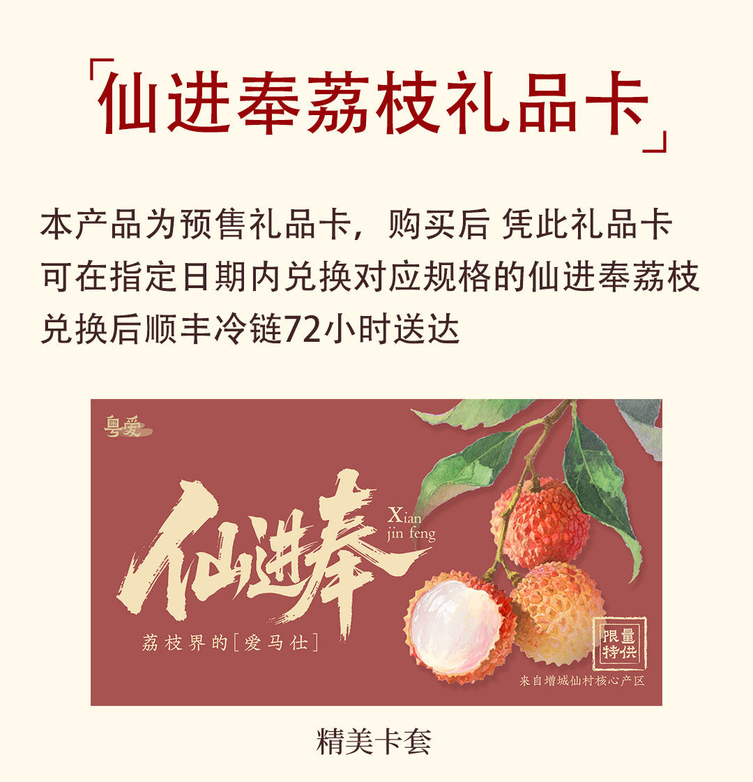 荔枝礼品卡【粤爱优选仙进奉】——贡品荔枝仙村核心产区产量有限爆甜多汁(6月25日起发货)