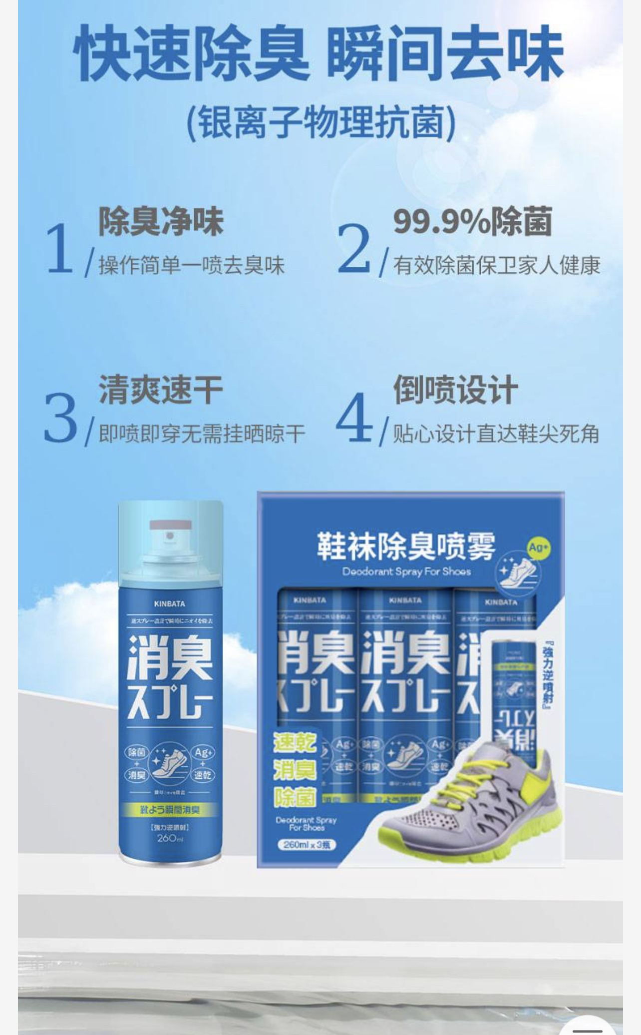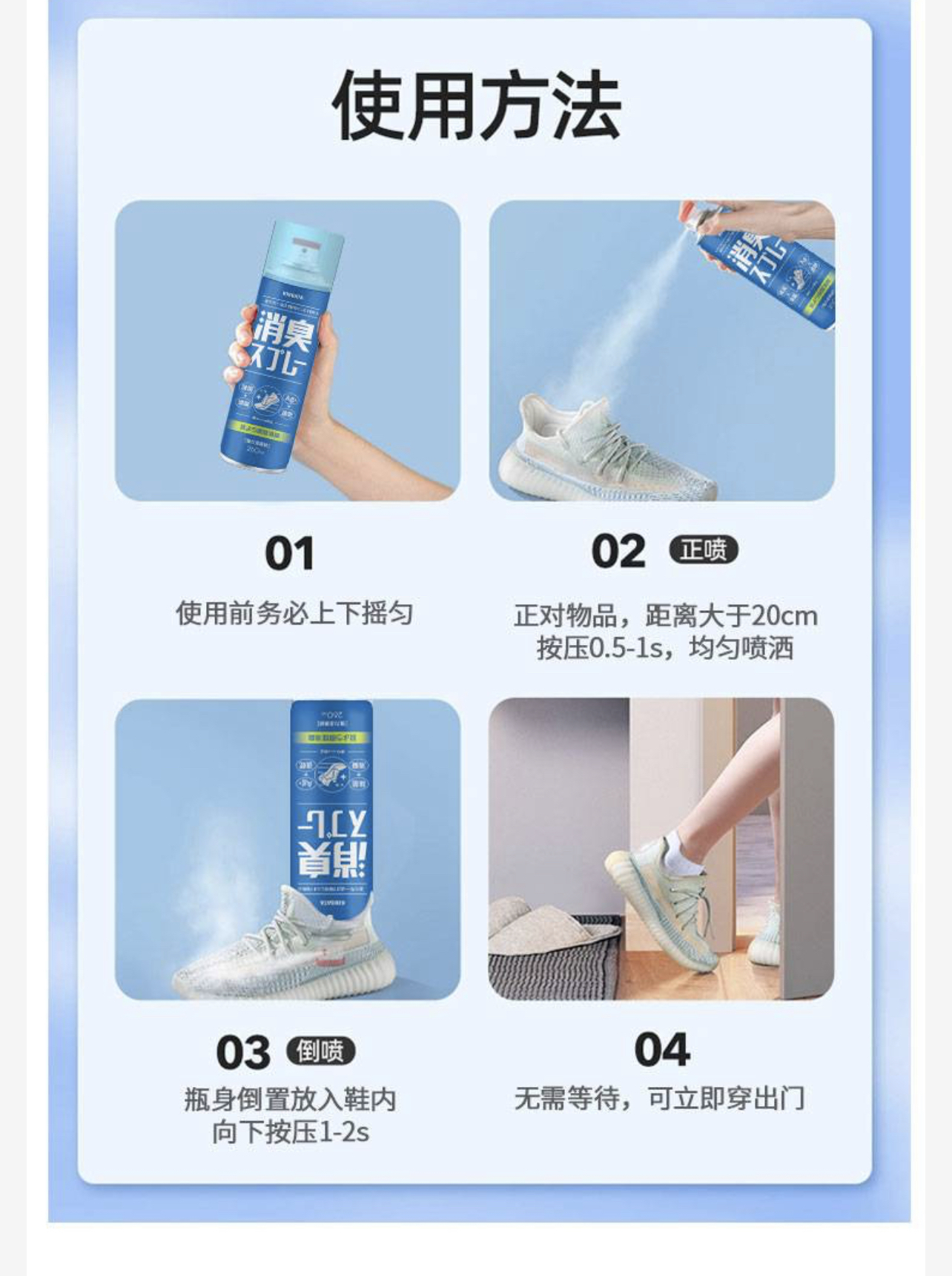 很多妹子都发现,鞋子穿几天了,走路走多了或运动后,足部容易出汗,并散发出难闻异味,同时伴随着细菌,运动鞋洗多了对鞋子也有伤害,而且洗鞋的时候内部犄角旮旯也很难清洗,有了这款喷雾就方便多了!