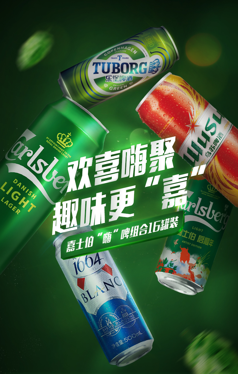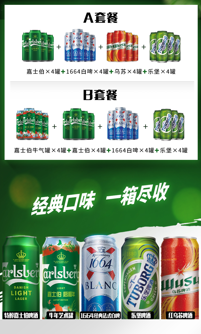 [官方] 嘉士伯+1664白啤+红乌苏+乐堡合计500ml*16罐啤酒听装整箱