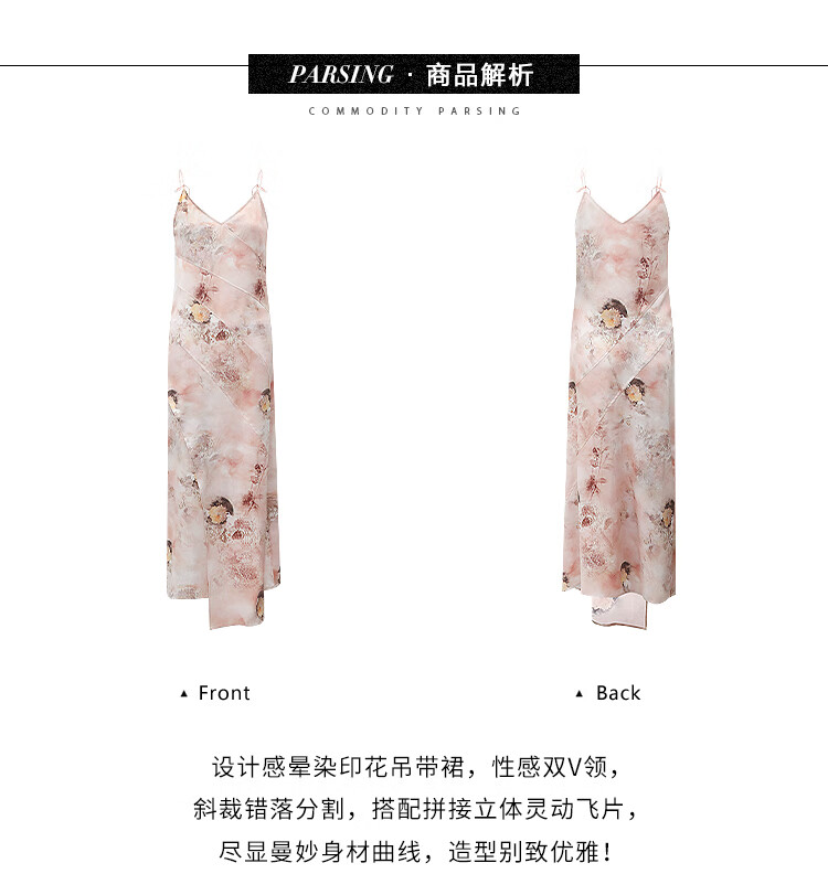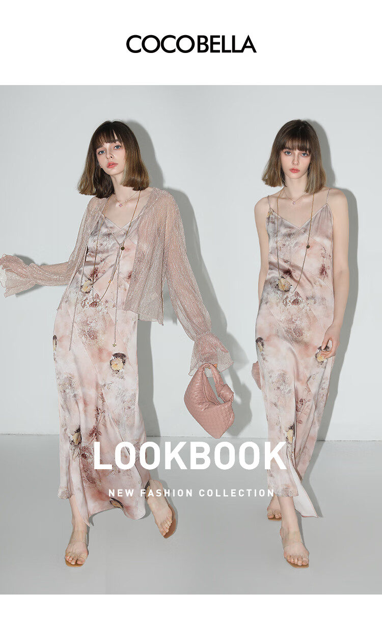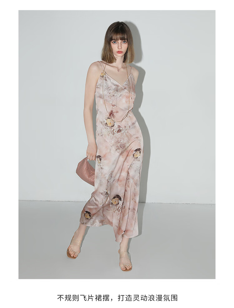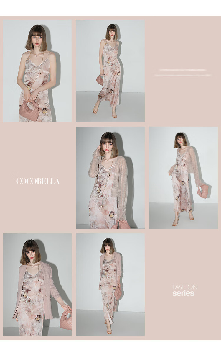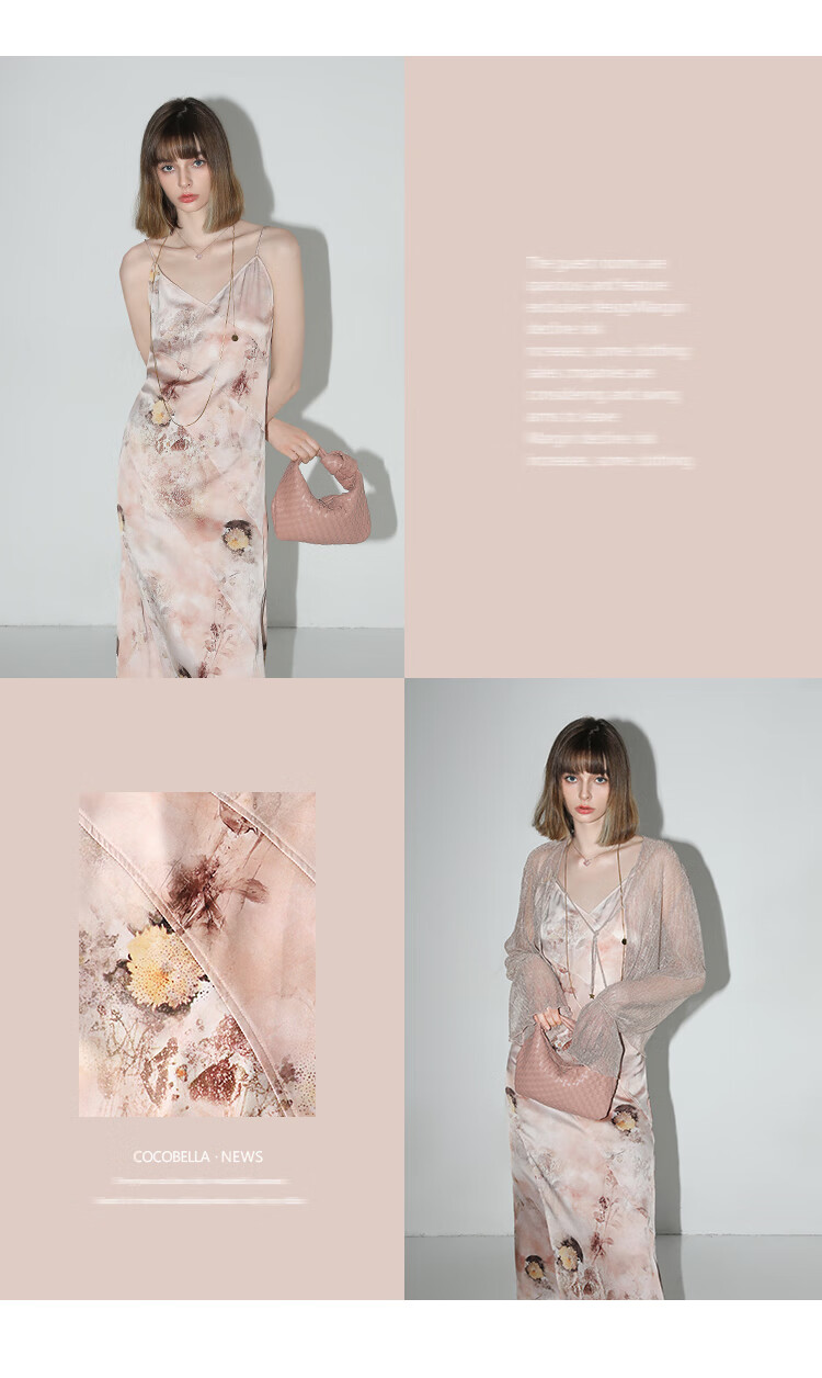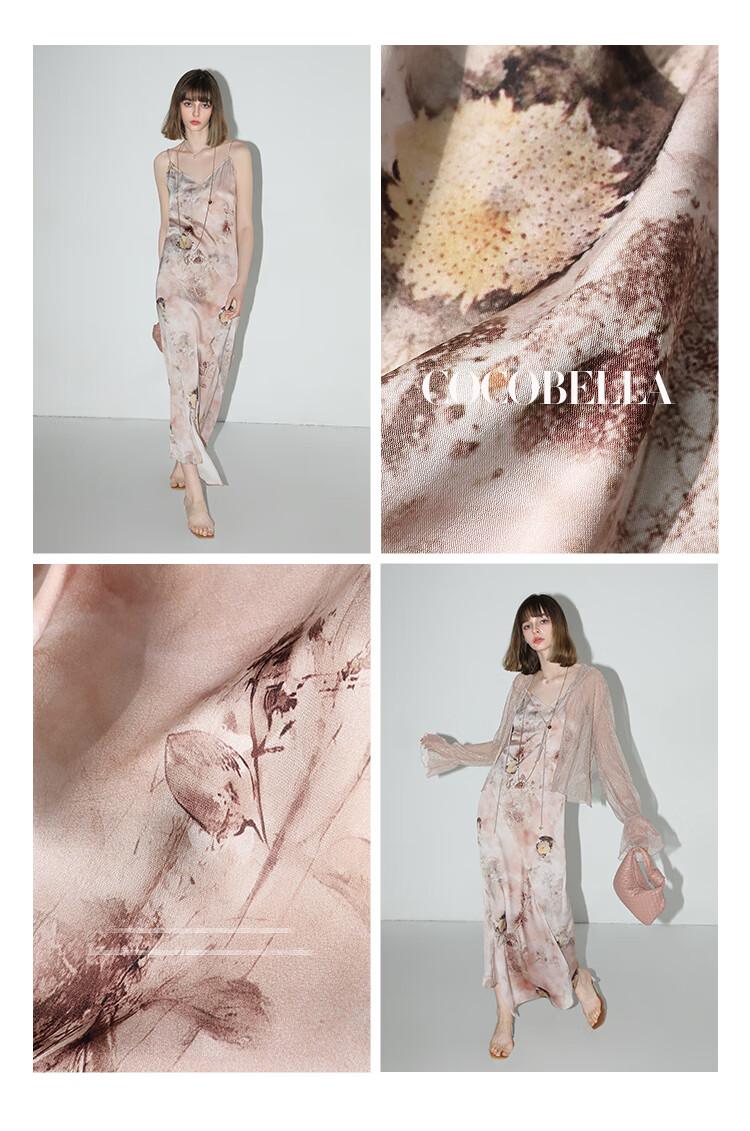 COCOBELLA设计感拼接晕染印花缎面吊带裙气质优雅连衣裙FR7037