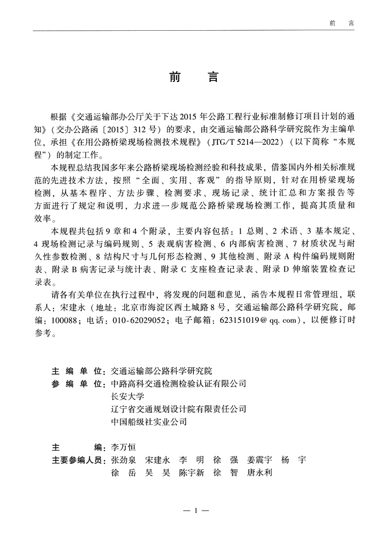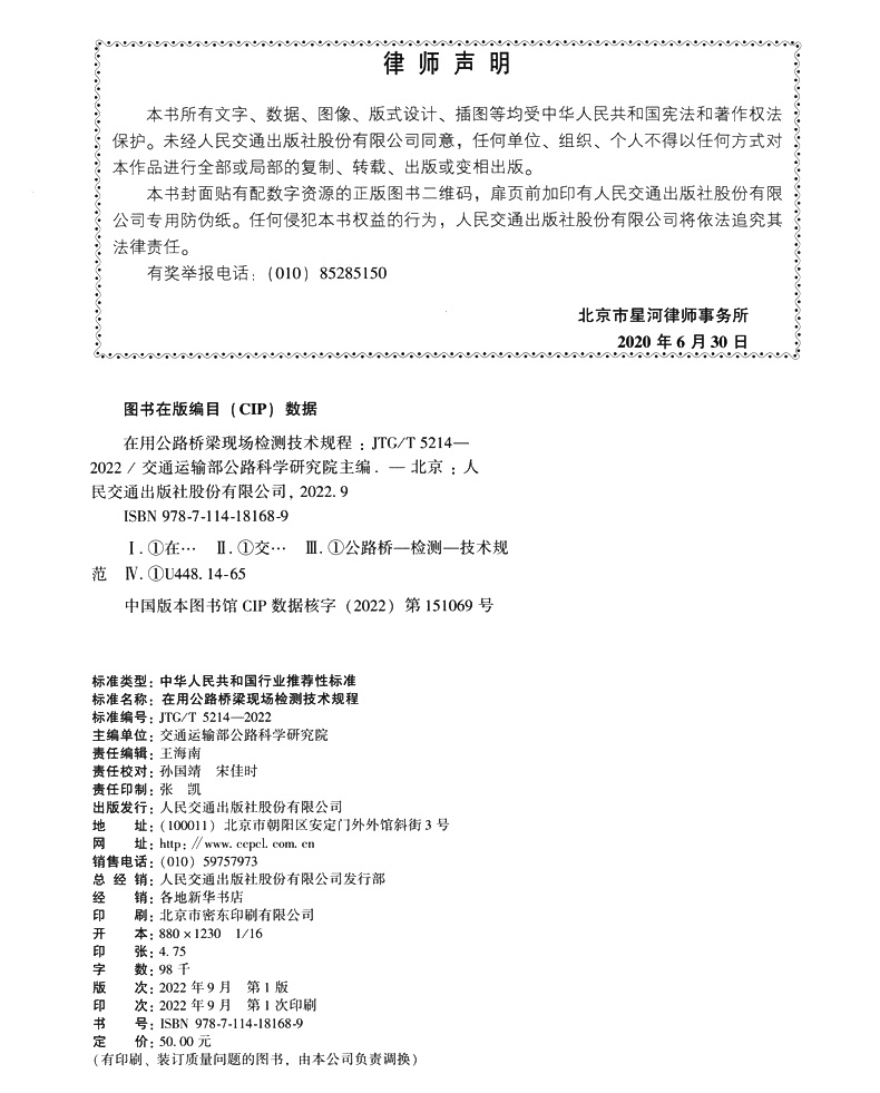 书名:在用公路桥梁现场检测技术规程(JTG/T 5214—2022)