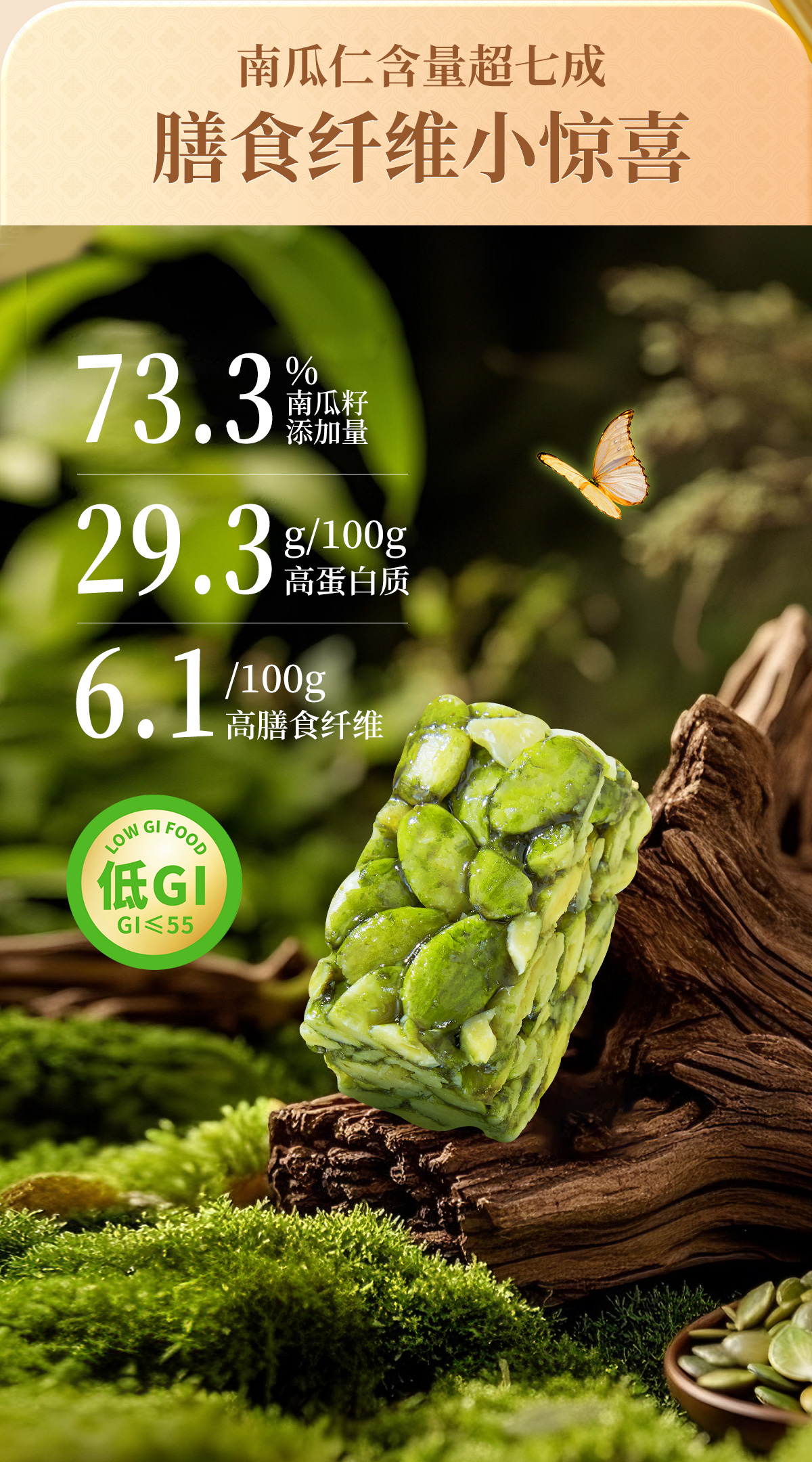 49.9元3袋【低GI南瓜籽酥】73.3%真南瓜籽+高膳食纤维|无蔗糖轻负担,谷物香满口!