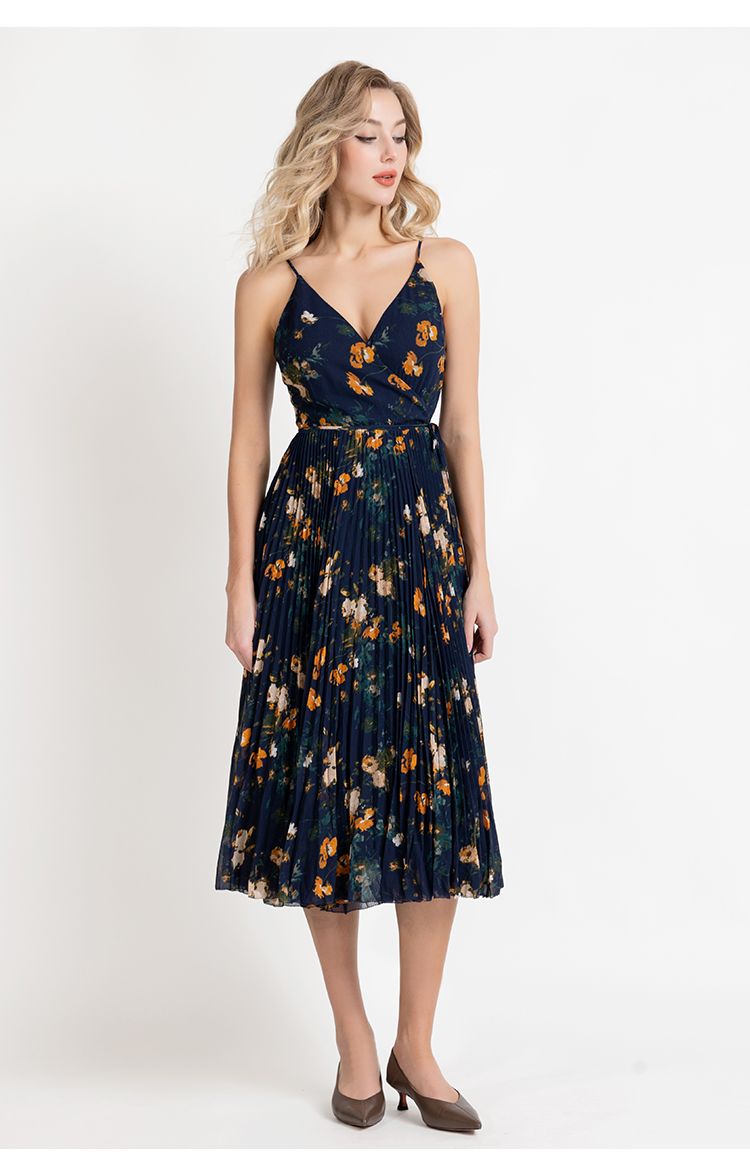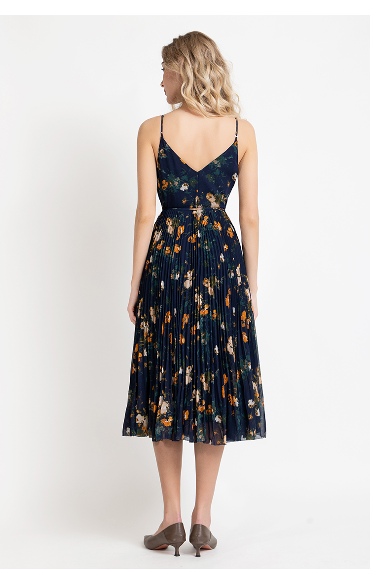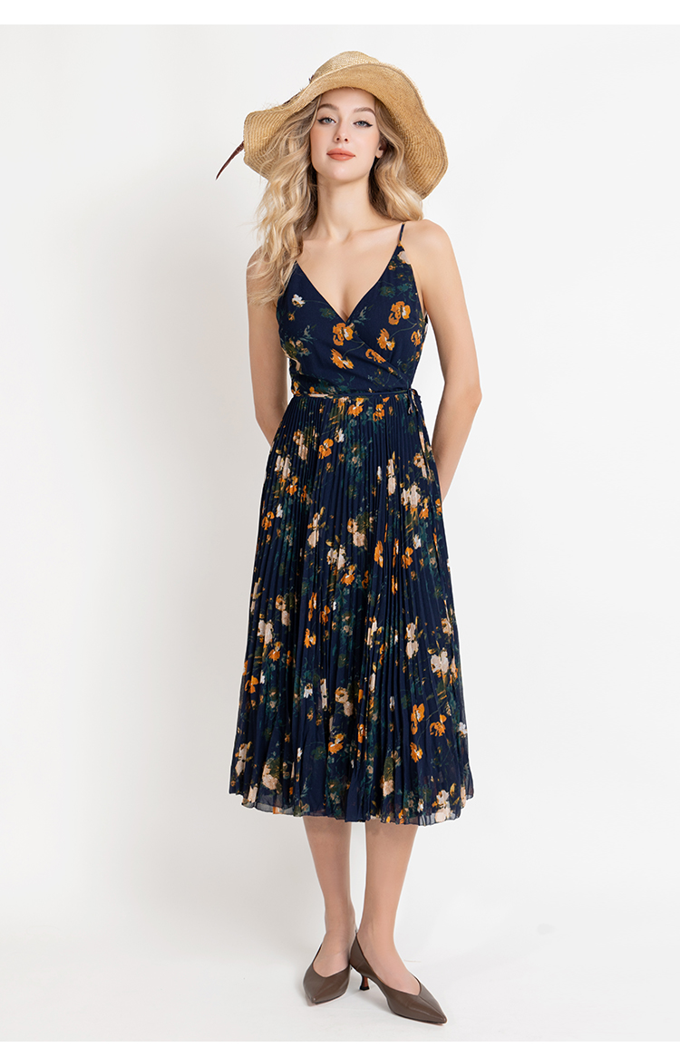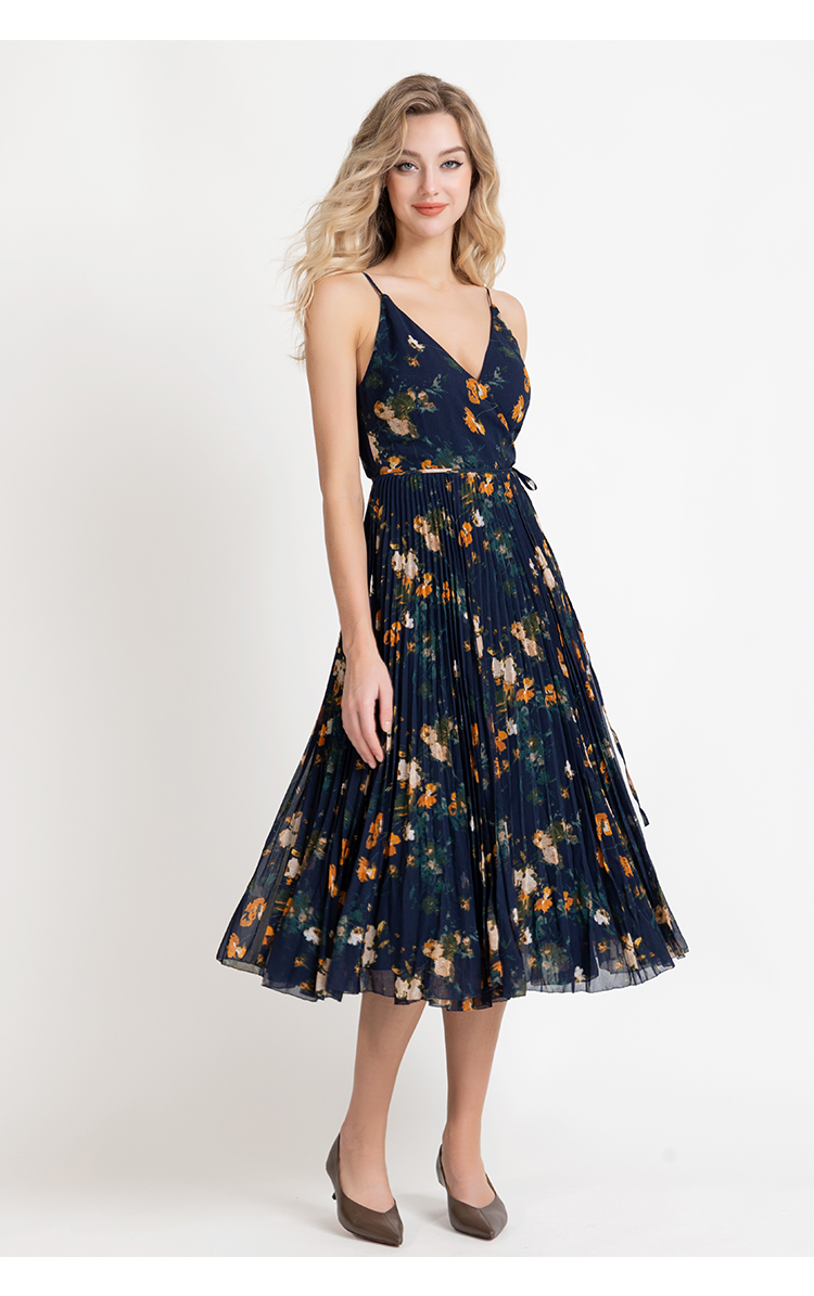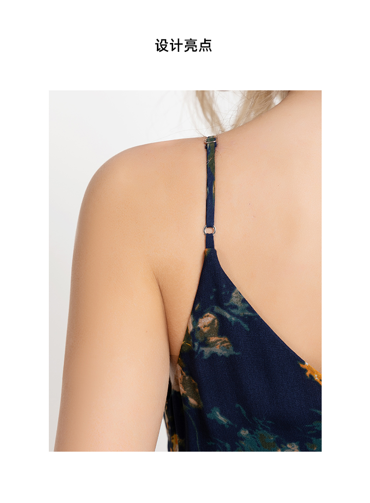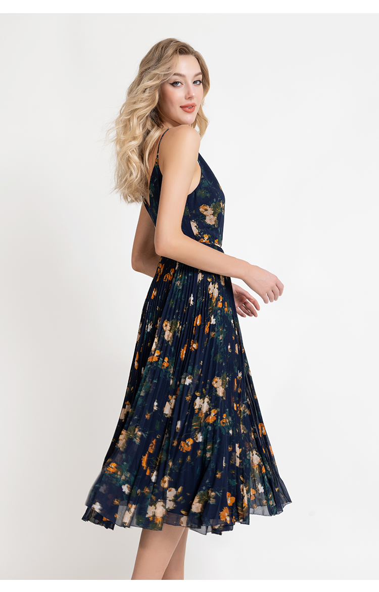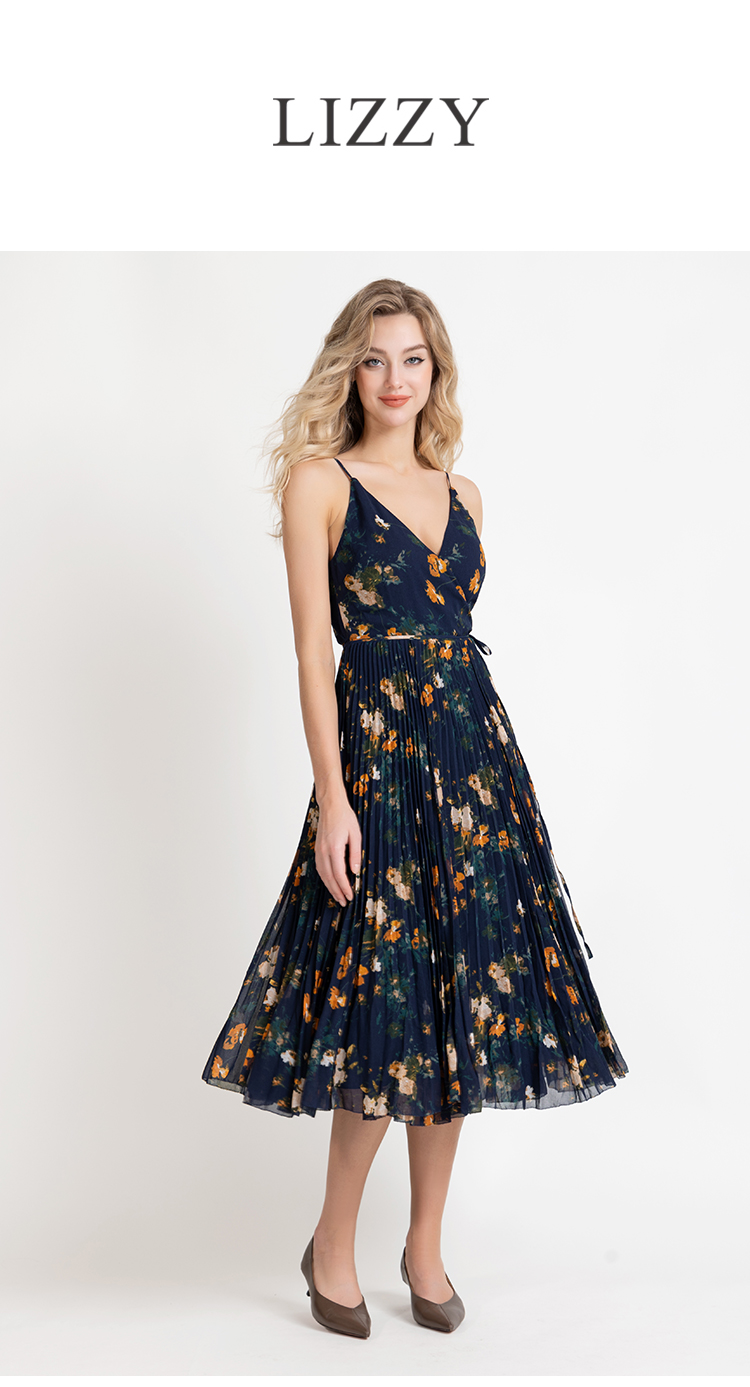 LIZZY 时尚优雅浪漫印花百褶一片式度假风裹身吊带连衣裙7997