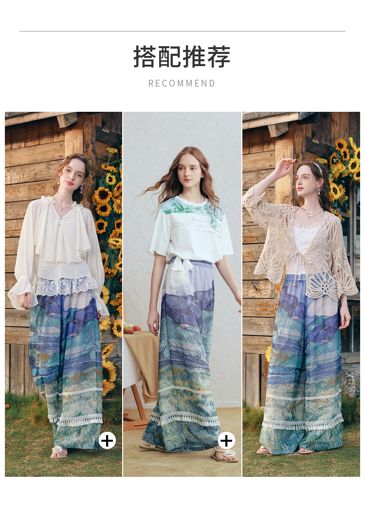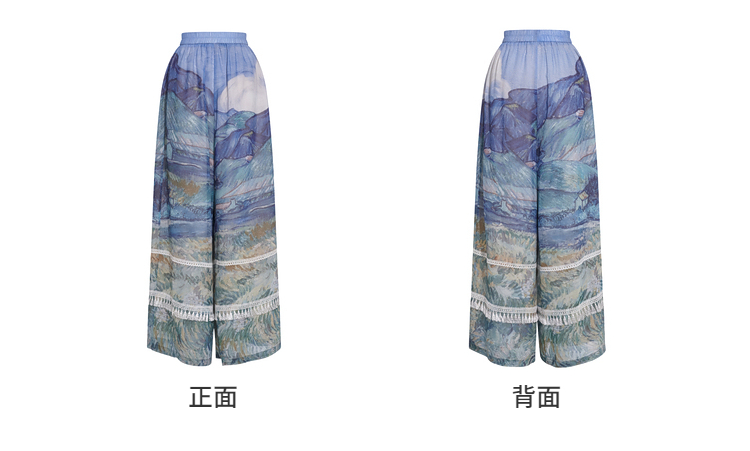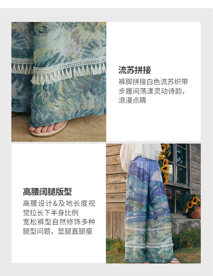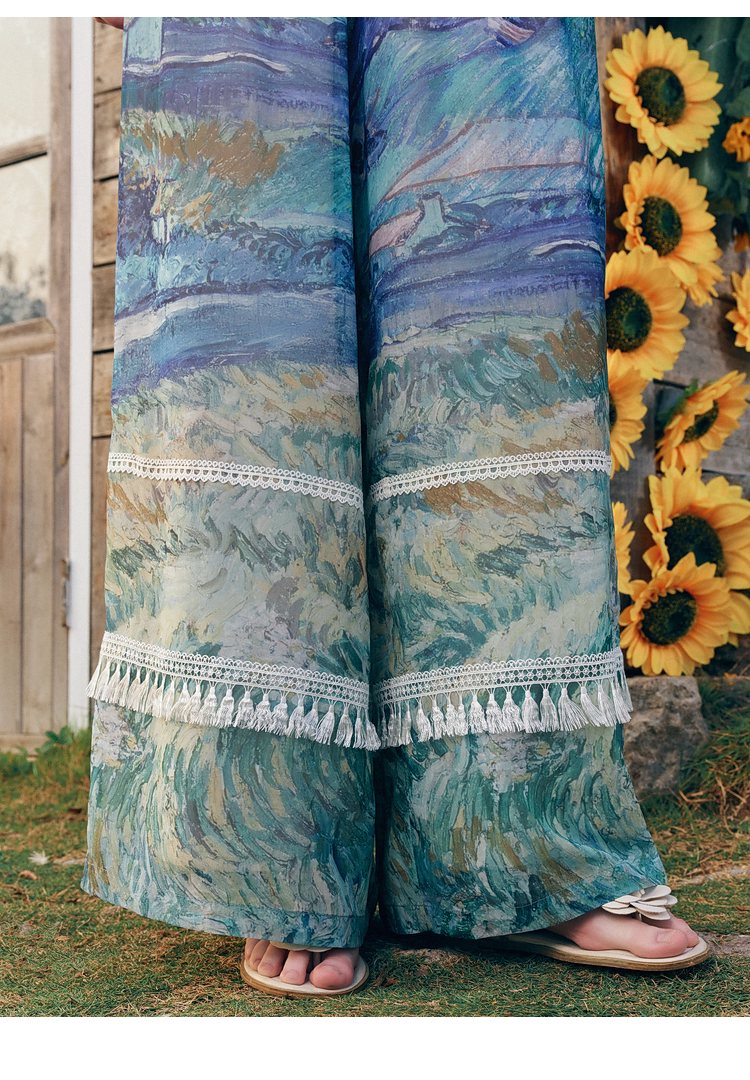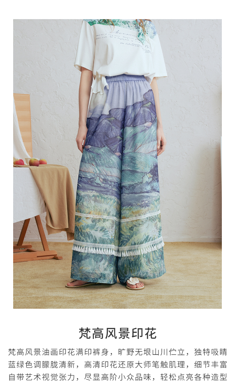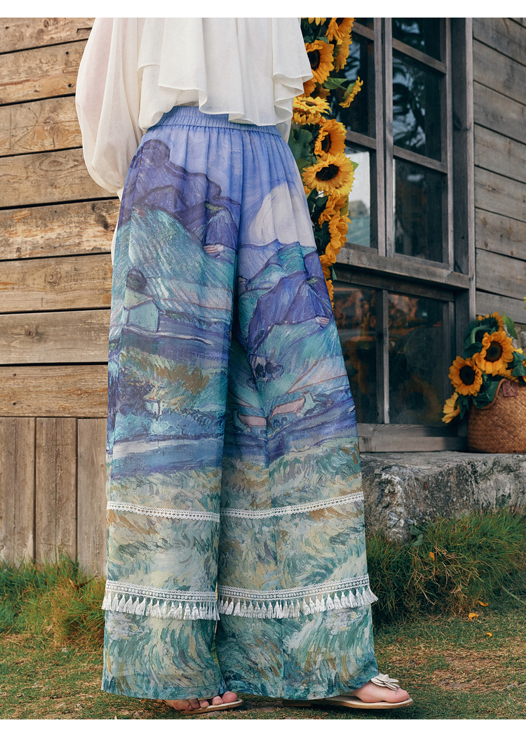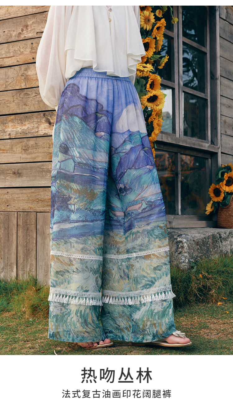 两三事梵高文艺热吻丛林2026春新款流苏裤脚印花高腰阔腿休闲裤女