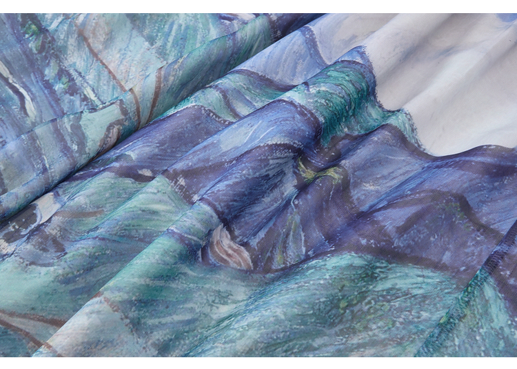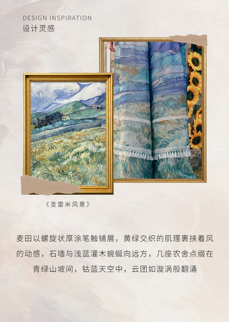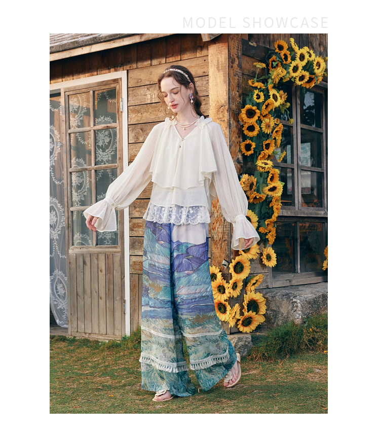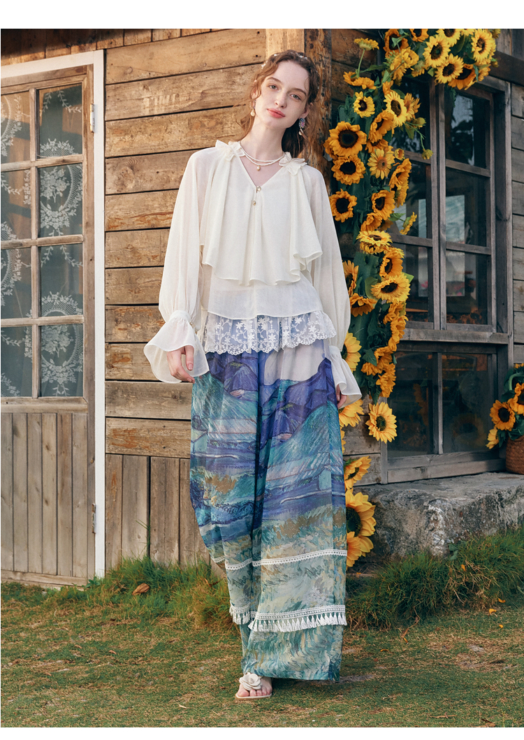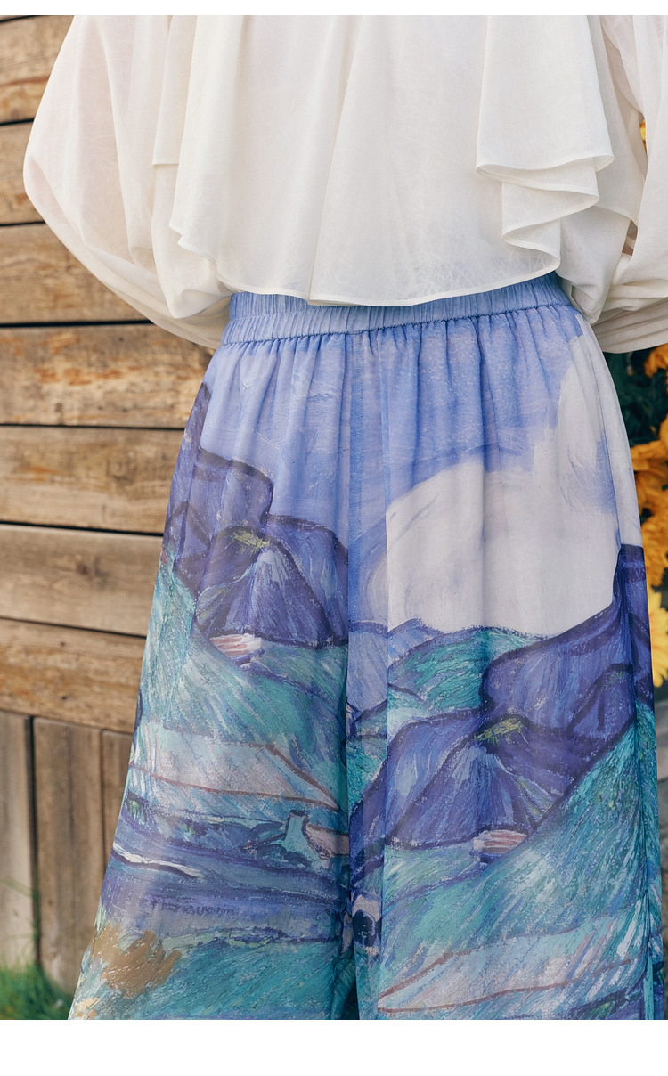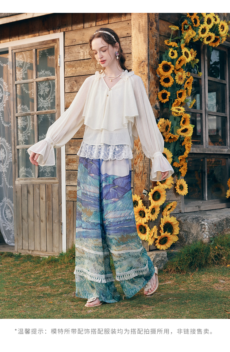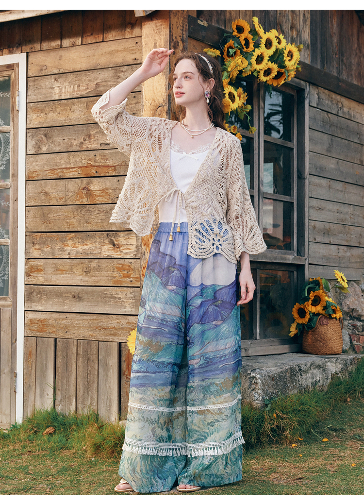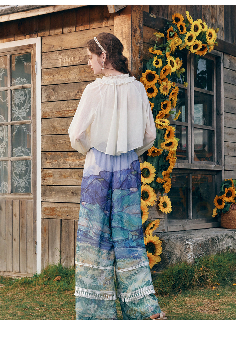 两三事梵高文艺热吻丛林2026春新款流苏裤脚印花高腰阔腿休闲裤女