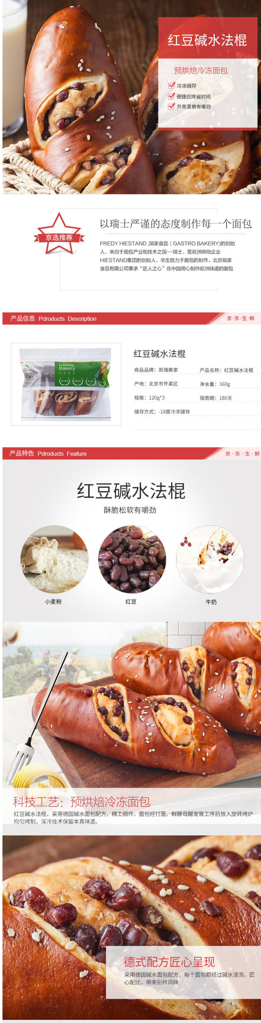 凯瑞美家 红豆碱水法棍360g 3个 西式面包 家庭早餐 冷冻烘焙下午茶点心 100015404327