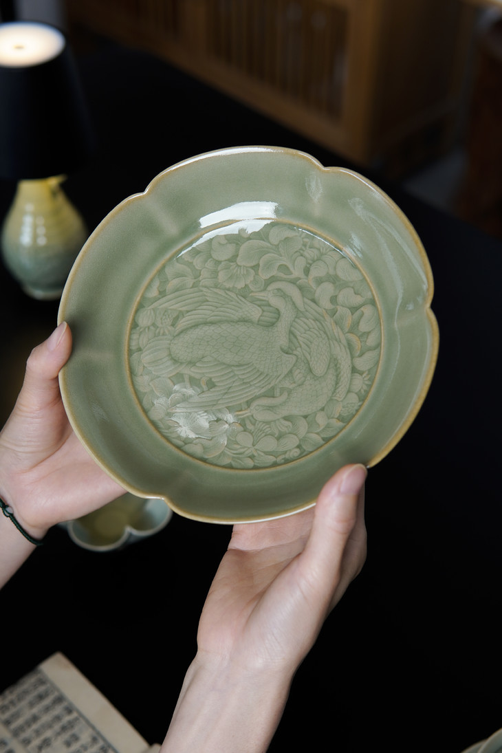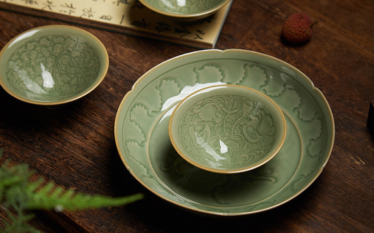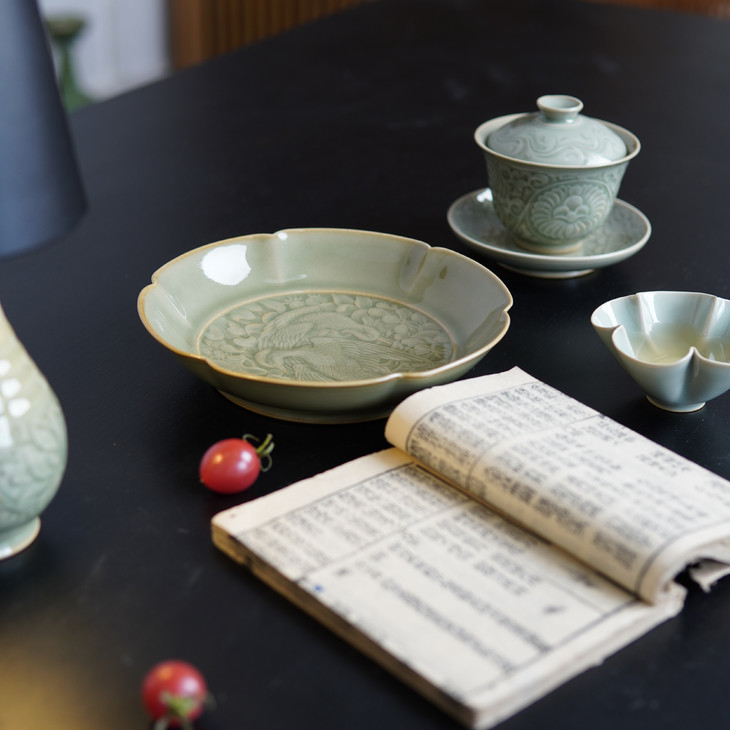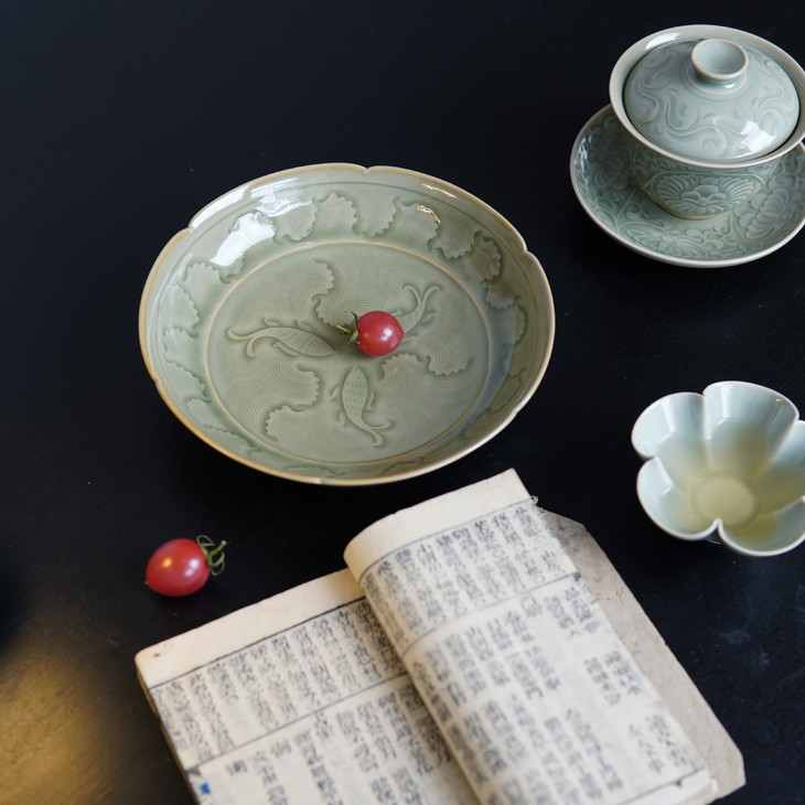 用耀州窑传统印花工艺复刻耀州青瓷茶盏、碗、茶盘(承)、茶则、茶宠、盖置等,同时也带来一款手工半刀泥瓷盘,数量有限,先到先得。