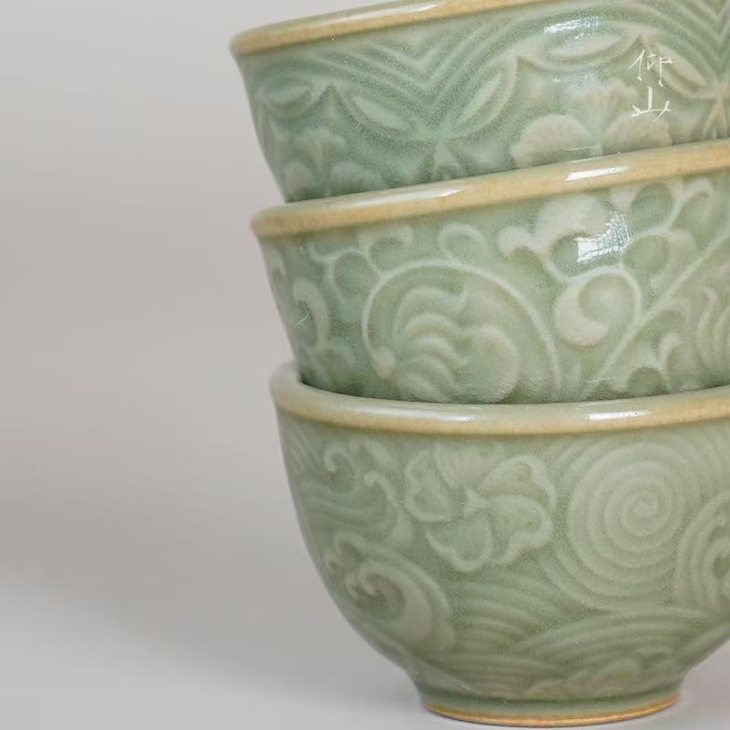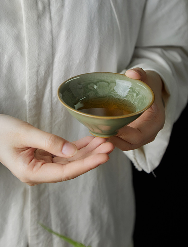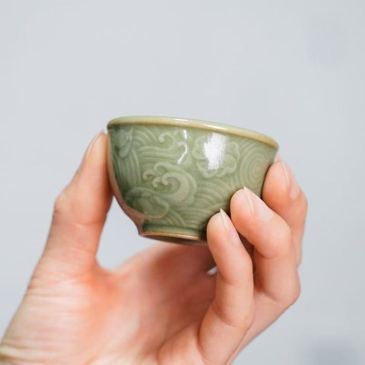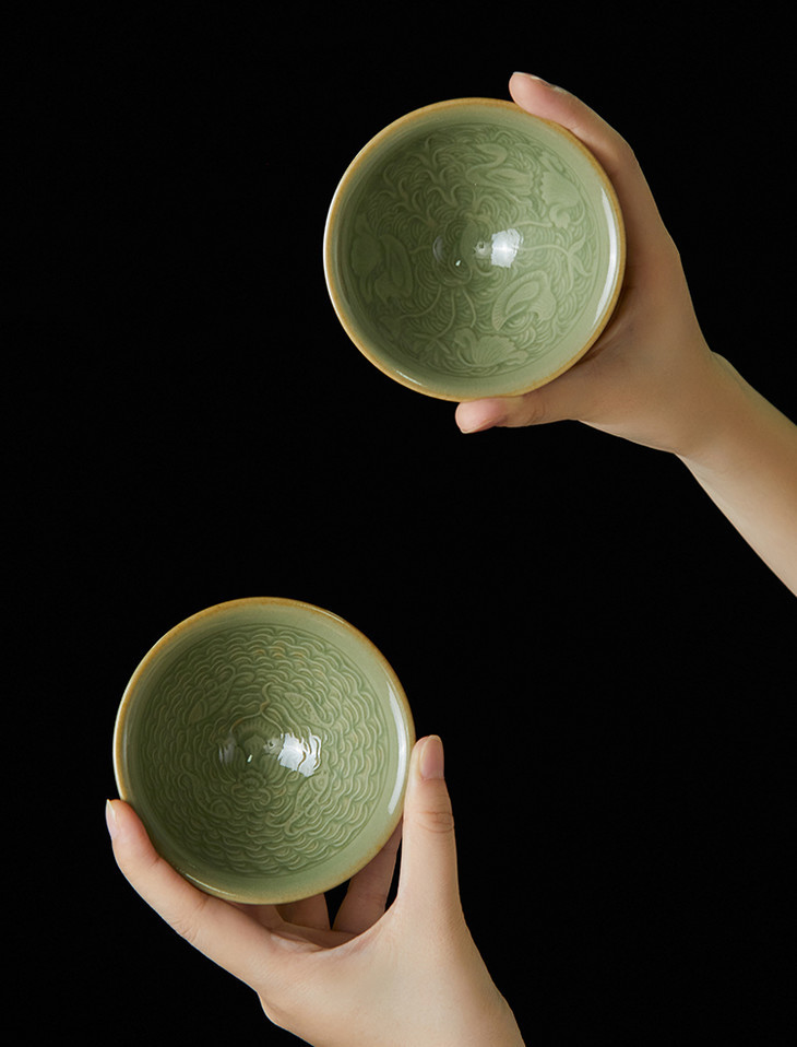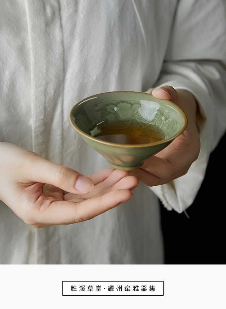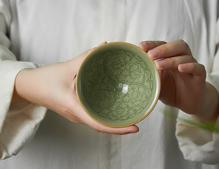 独门釉料秘方 |两次上釉,釉色苍翠欲滴,淡雅素净,配比稍有偏差,竹青煞变姜黄。盛茶时,厚釉能让水温下降的速率比别的杯子慢,留住茶香。