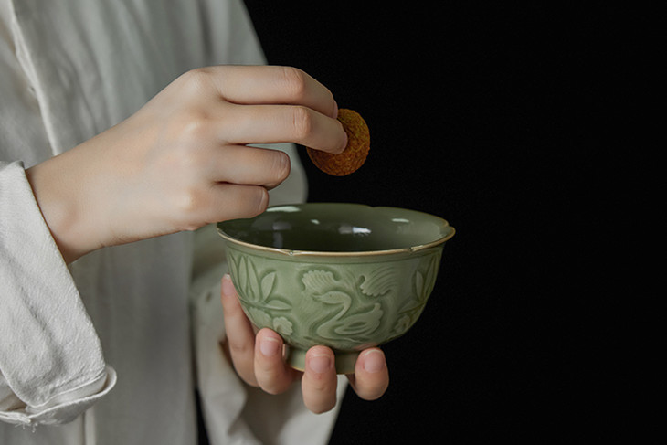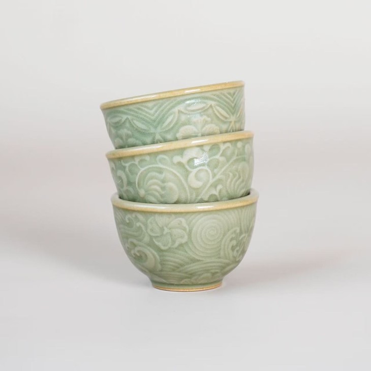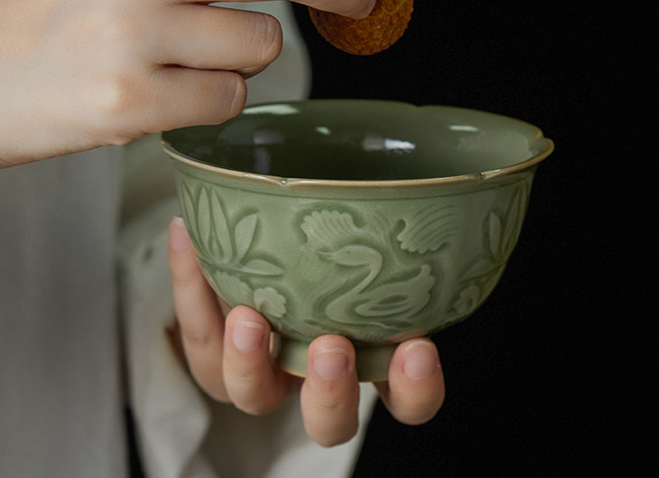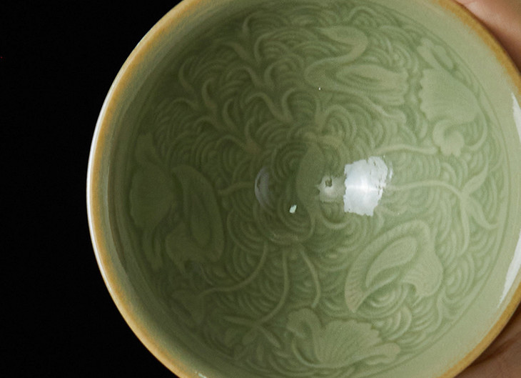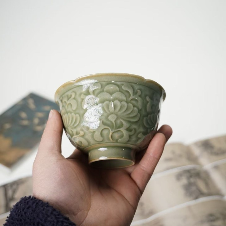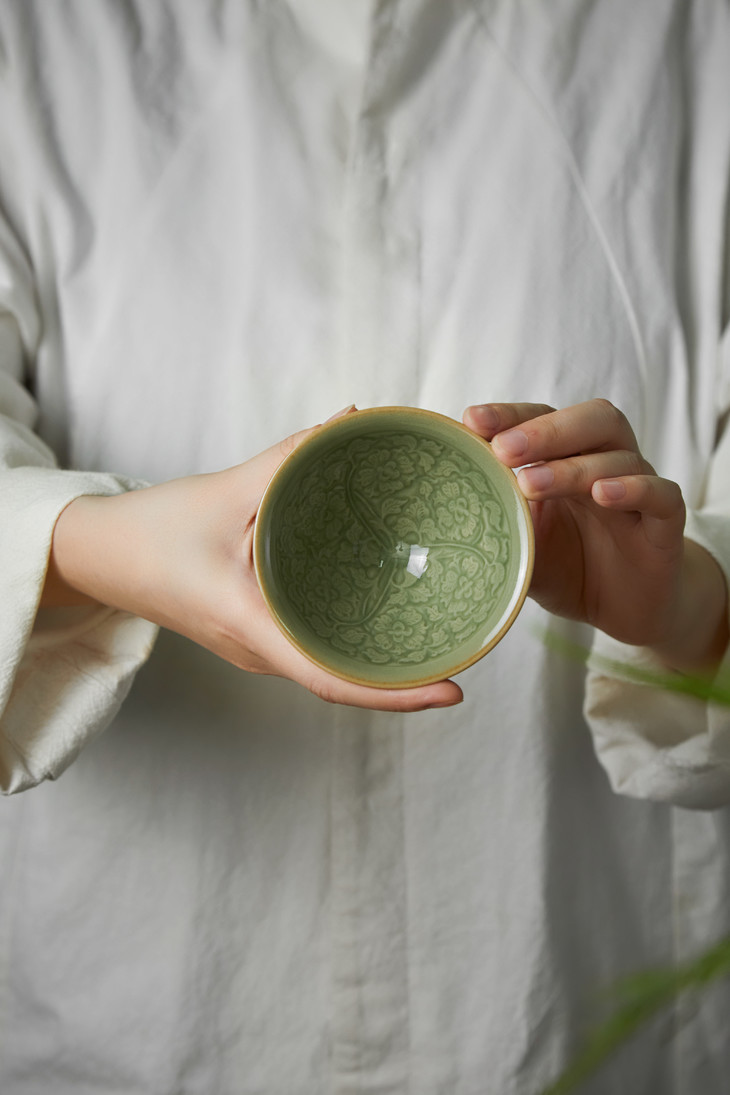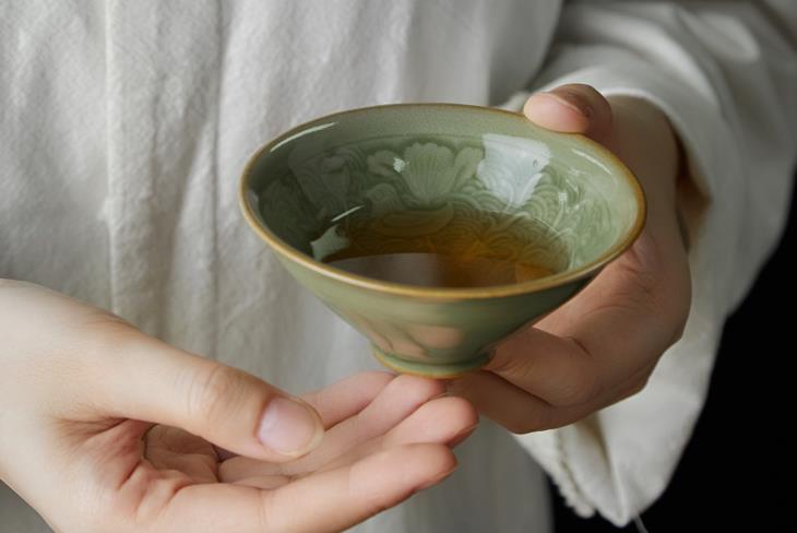 独门釉料秘方 |两次上釉,釉色苍翠欲滴,淡雅素净,配比稍有偏差,竹青煞变姜黄。盛茶时,厚釉能让水温下降的速率比别的杯子慢,留住茶香。