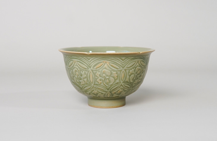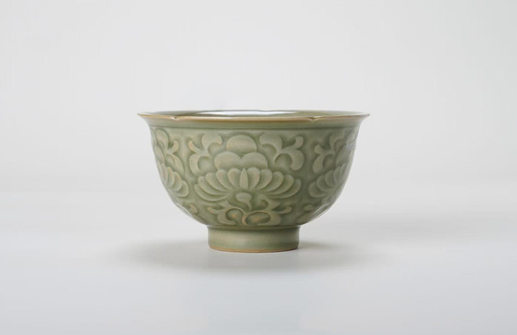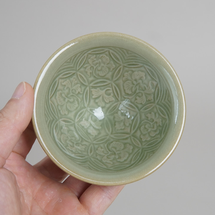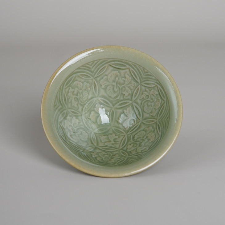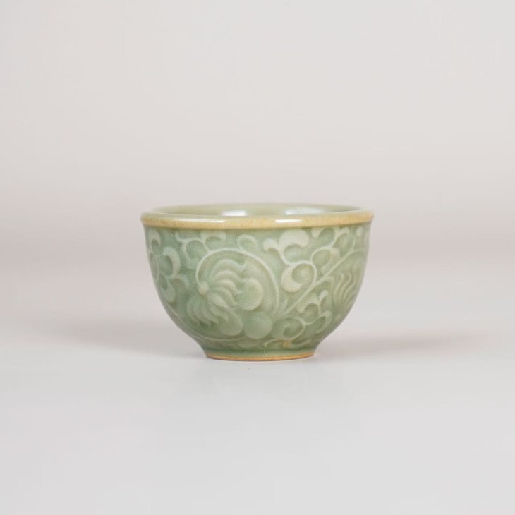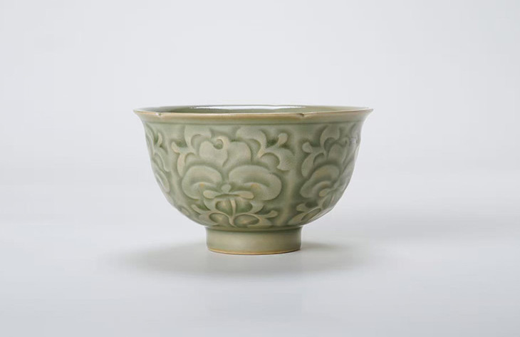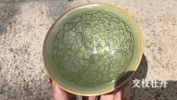 外壁不繁不艳,盏内自傲夺目。繁复精美的缠枝牡丹,与外壁素面衬托张弛有度。