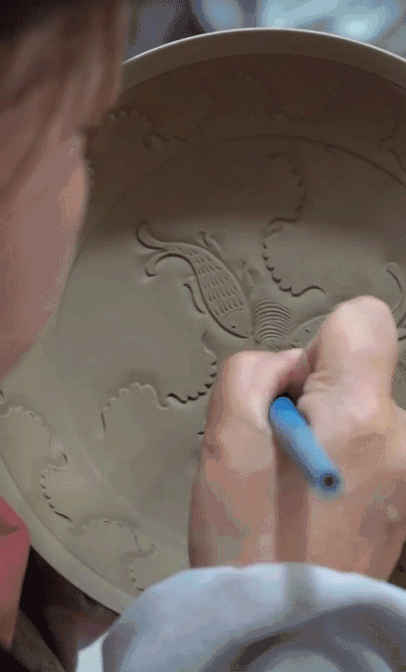 耀州窑传统手工印花/双刀刻花绝技 | 印花款的母范模都是程坤老师亲雕亲制模具,做成后由熟练的印花匠人,手工印花而成。