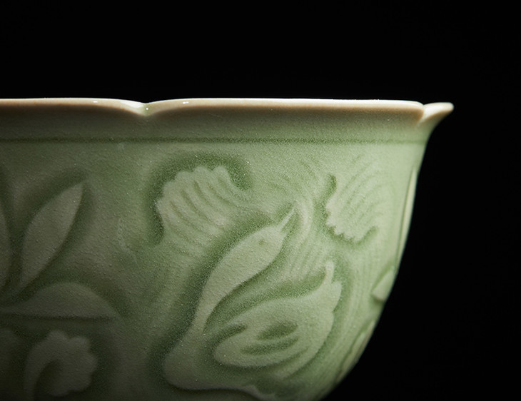 盏内是水波纹中鸳鸯戏莲,莲叶纹理清晰可见,趣味十足,表达了对夫妻和谐与子孙繁荣的美好祝愿,寓意家庭美满。