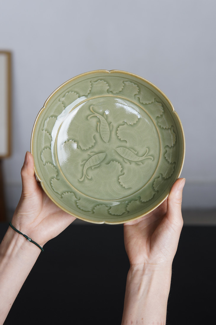 三鱼盘由程坤老师设计,将三鱼的纹饰加入水波纹,增加了灵动性与工艺看点。