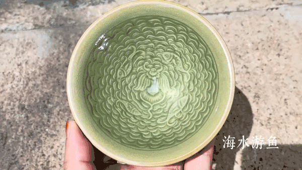 复刻北宋古瓷纹样,碗內印刻11层水波纹,中间有4条腹向上,背朝下的鱼纹,鱼相向对称,水波灵动,游鱼生灵活现,若隐若现。