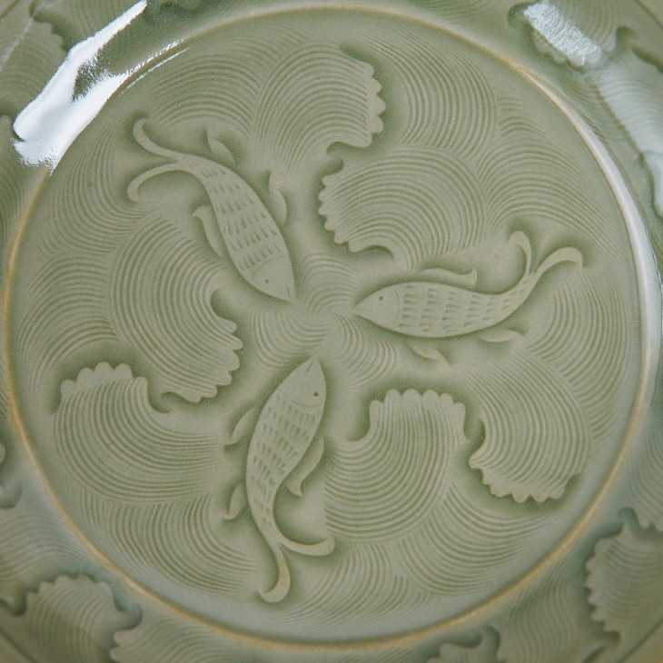 三鱼葵口盘全手工半刀泥刻,发色明亮,有底足防烫。