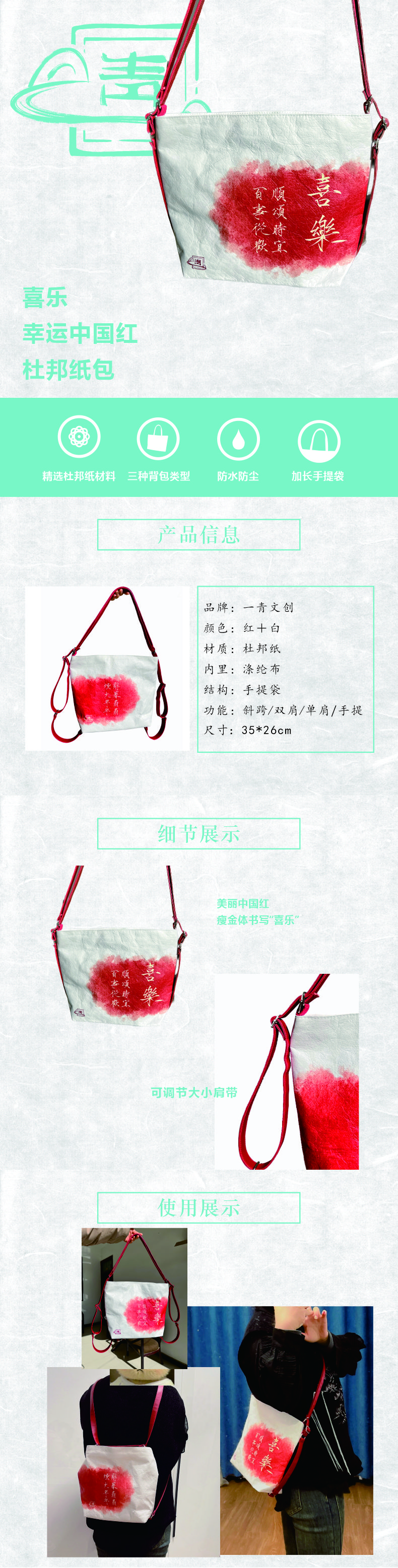 喜乐幸运中国红杜邦纸包35*26cm 精选邦纸材料 防水防尘 可调节肩带大小 双肩/单肩/手提