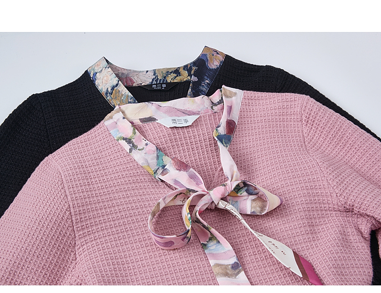 两三事不拘心迹小清新印花领带v领长袖衬衫女宽松衬衣
