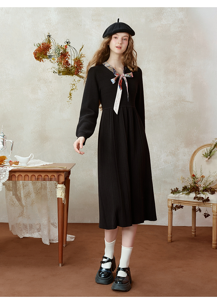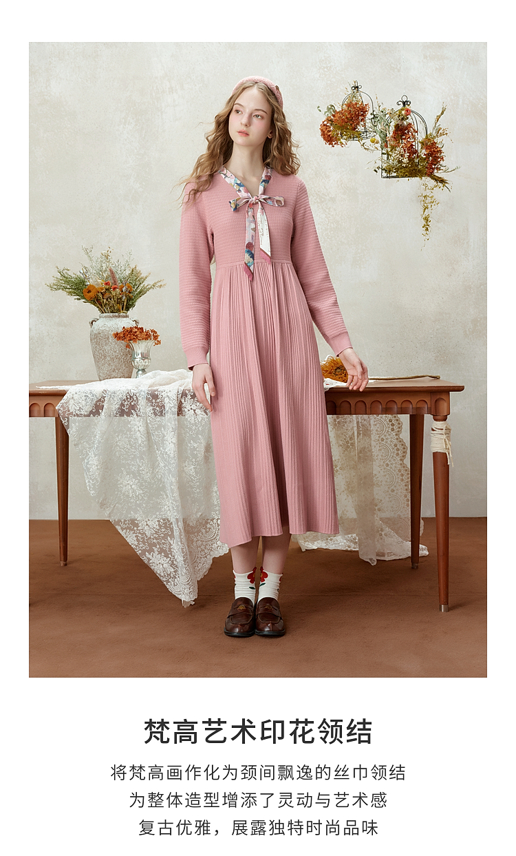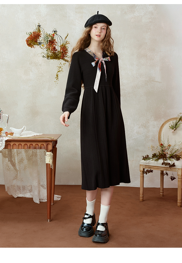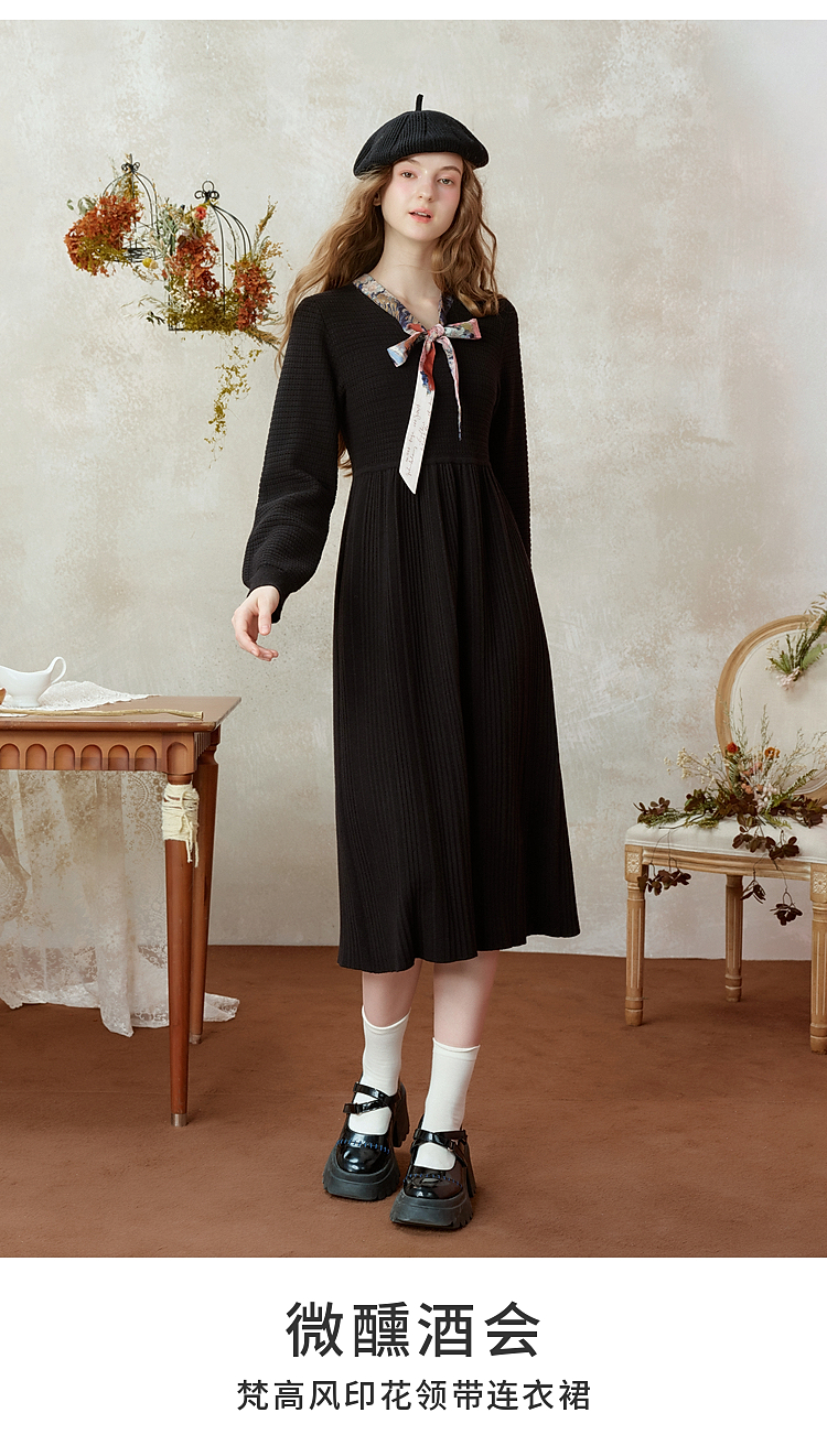 两三事梵高文艺微醺酒会2025冬季新款印花领带a字连衣裙气质长裙