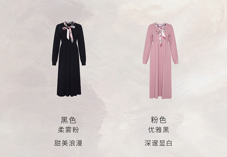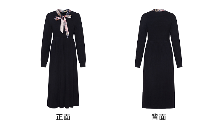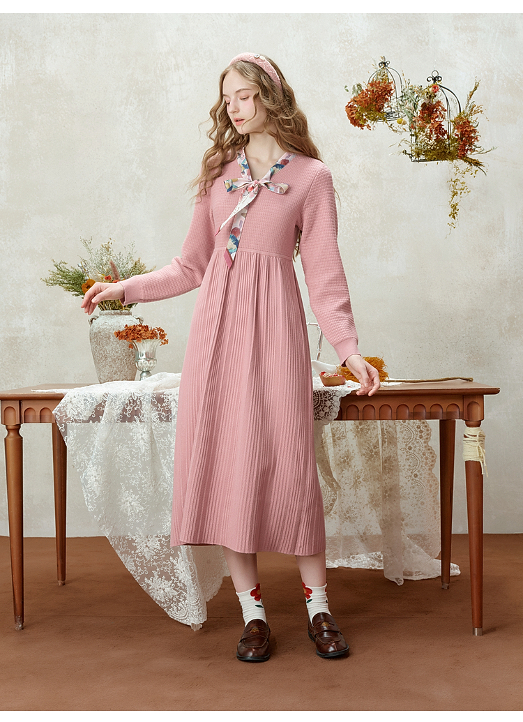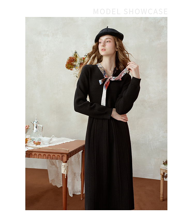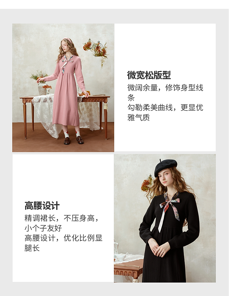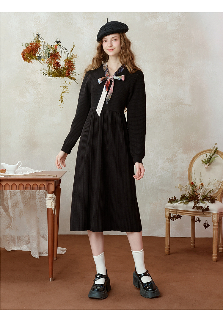 两三事梵高文艺微醺酒会2025冬季新款印花领带a字连衣裙气质长裙
