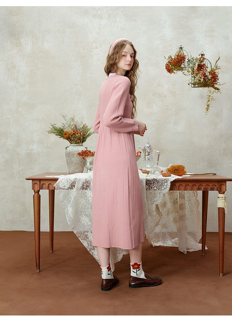 两三事梵高文艺迷雾芳影法式蕾丝拼接灯笼袖绣花连衣裙
